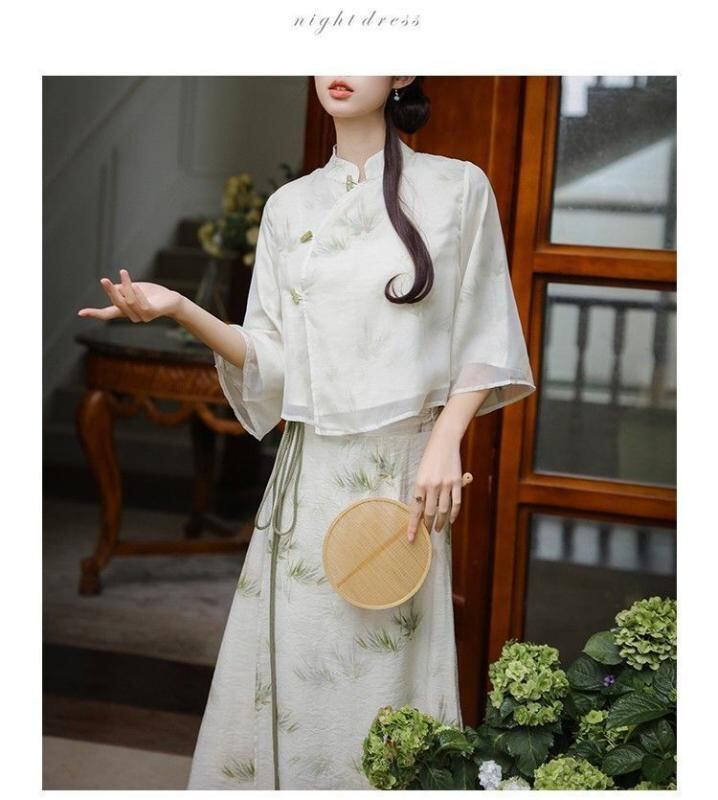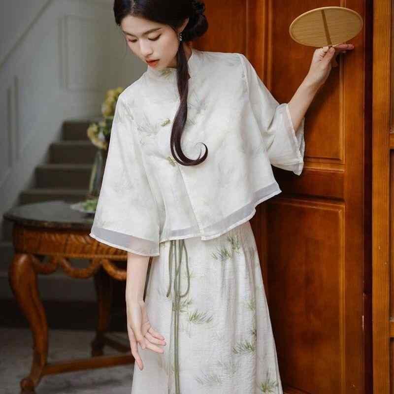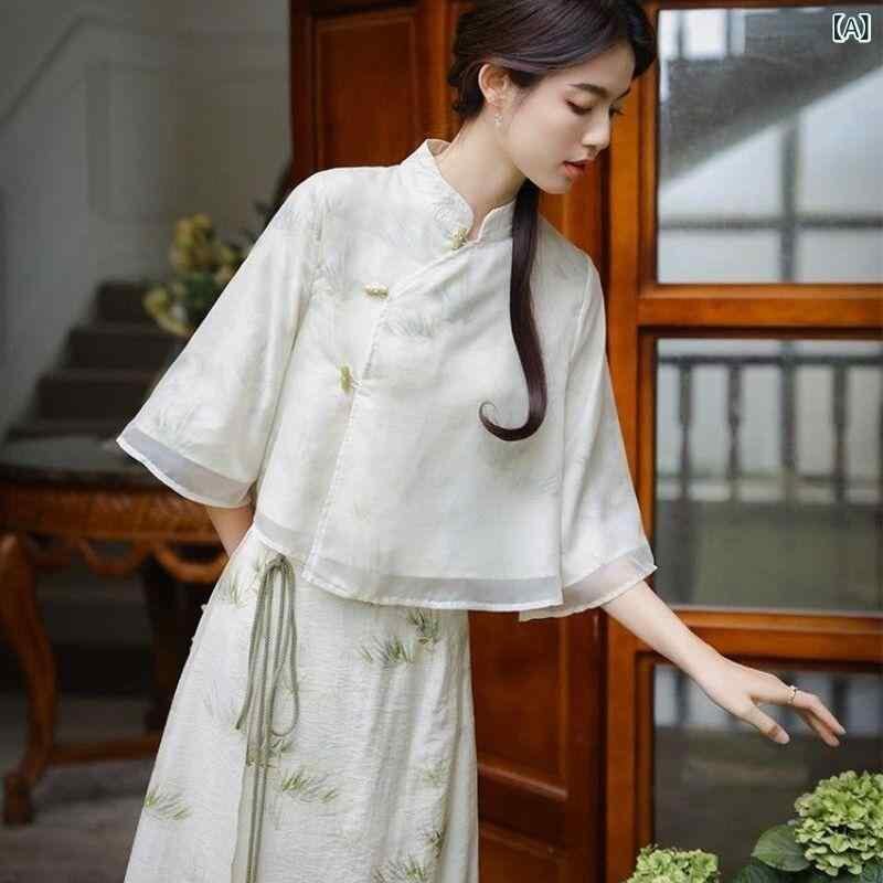 ワンピース レディース 改良チャイナドレス ツーピース 新中華風 エレガント ゆったり ミモレ丈 七分袖 ラウンドネック ポリエステル 通勤 カジュアル ライトグリーン