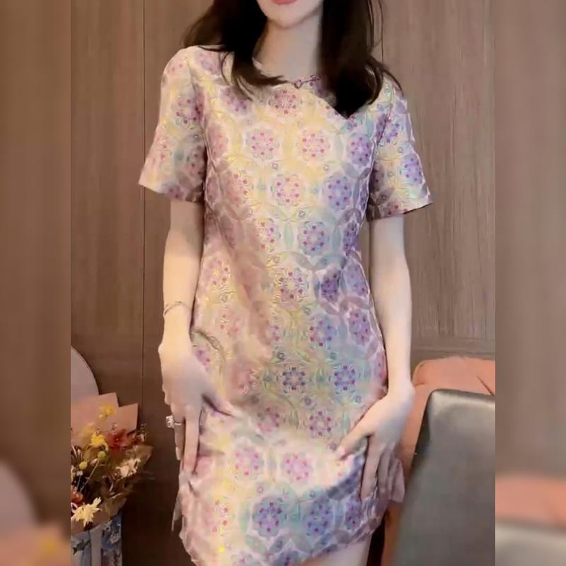 ワンピース レディース 中国風 チャイナ風 ジャガード織り 光沢サテン アセテート TR素材 Aラインシルエット ラウンドネック 半袖 ミニ丈 ショート丈 レトロ エレガント 上品 夏 大人