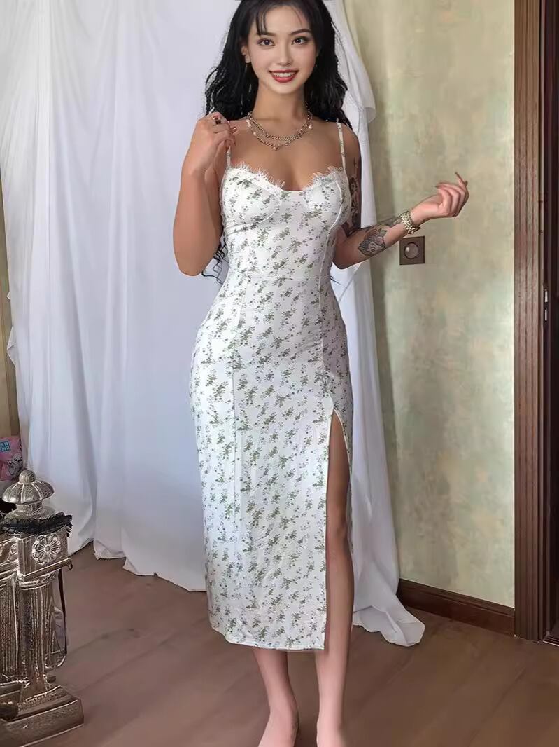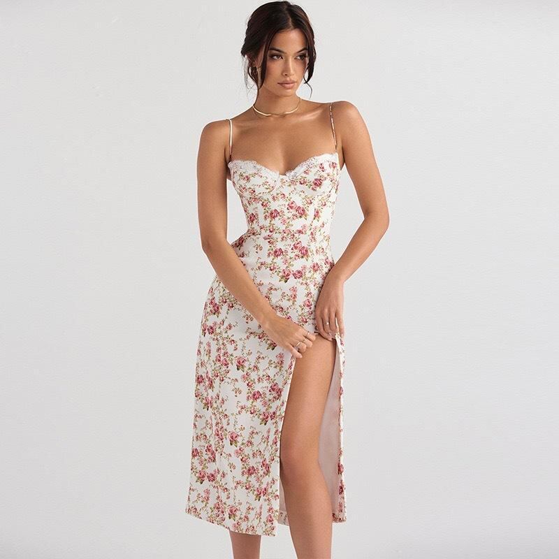 キャミソールワンピース レディース 小花柄 プリント スリット ロング丈 Aライン 再生繊維 ポリエステル ストレッチ ヘルシー セクシー 大人カジュアル フェミニン リゾート デイリー