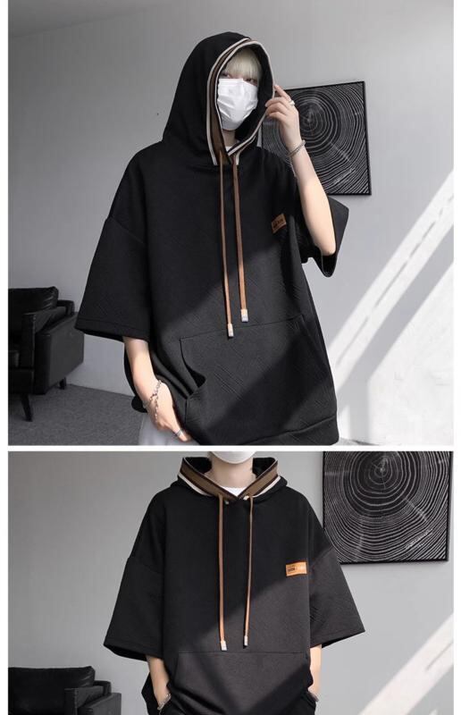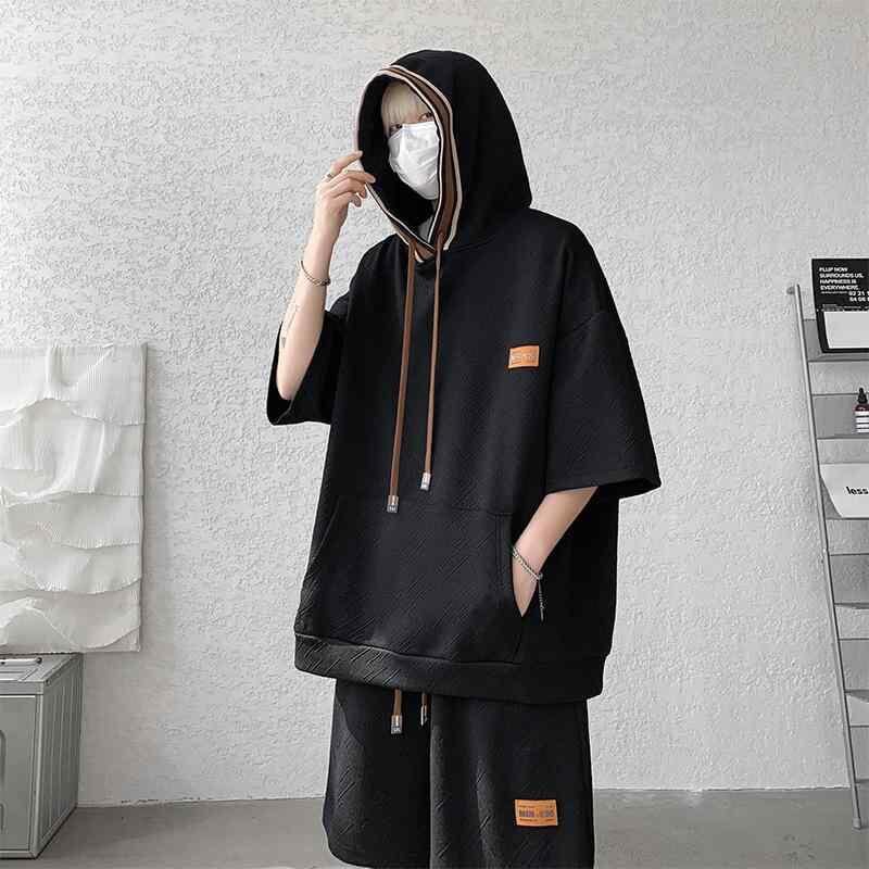 セットアップ メンズ 男性用 フード付き スウェット パーカー 半袖Tシャツ ハーフパンツ ポリエステル素材 薄手 軽量 吸湿速乾 接触冷感 ゆったり ビッグシルエット カジュアル スポーツ 普段使い 部屋着 夏服 黒 白