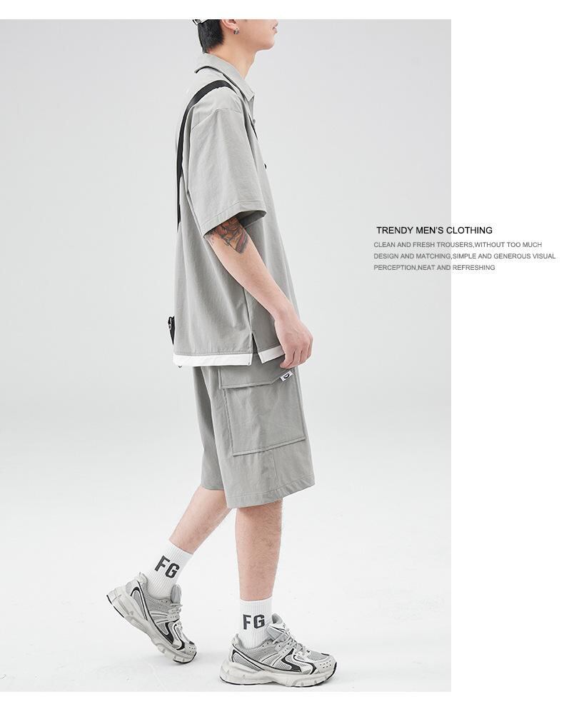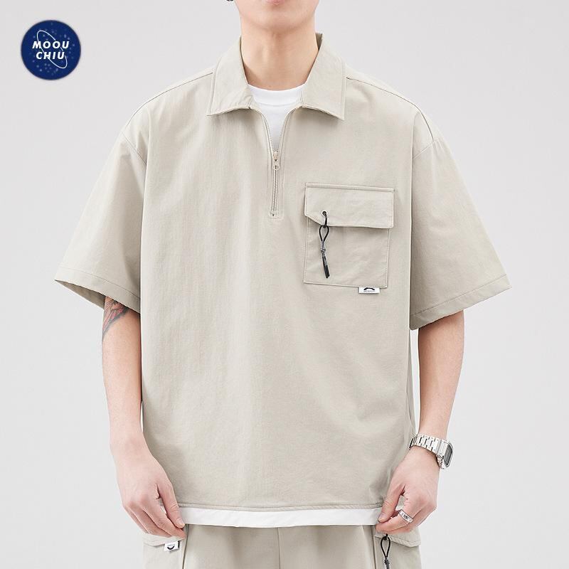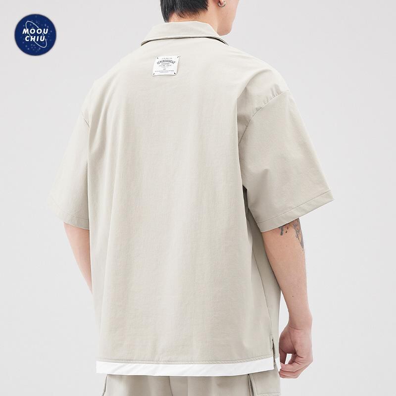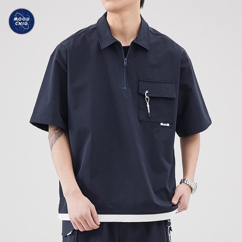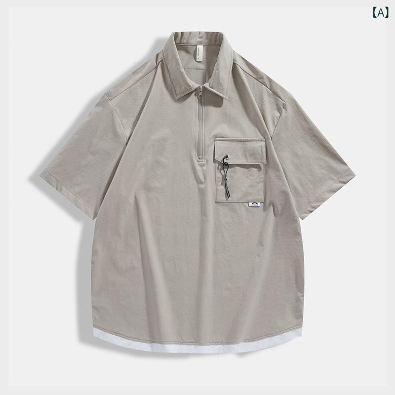 ポロシャツ メンズ 半袖 ハーフジップ フェイクレイヤード 夏 アウトドア カジュアル ルーズフィット アメリカンレトロ ナイロン混紡 通気性 耐久性 ウォッシャブル アプリコット グレー ロイヤルブルー