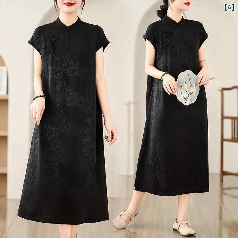 ワンピース レディース 綿麻 レトロ クラシカル 中華風 民族調 チーパオ チャイナドレス ジャカード織り 盤扣 チャイナボタン ゆったり 大きいサイズ 体型カバー Aライン ハイネック フリル袖 ロング丈