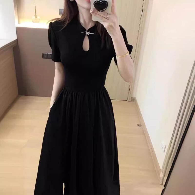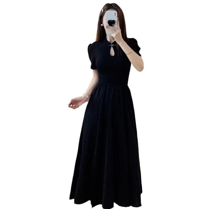 ワンピース レディース 大きいサイズ ゆったり 体型カバー 新チャイナドレス 改良チャイナワンピース 中華風 レトロ クラシカル エレガント 黒 ブラック フレア Aライン サイドスリット 半袖 ポロ襟 パフスリーブ ミディ丈 ポリエステル