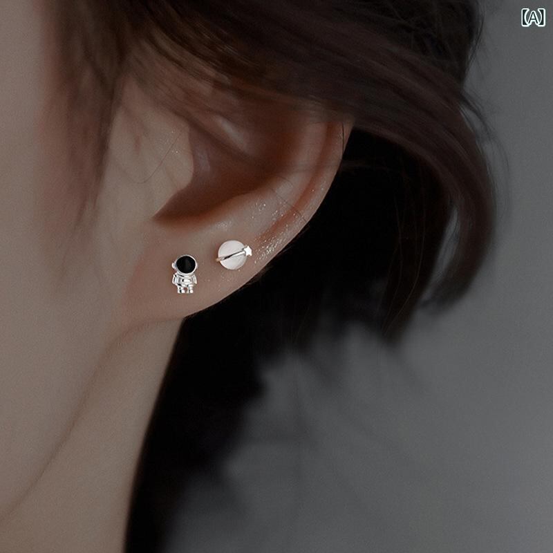 ピアス レディース 宇宙飛行士 モチーフ 猫眼石 星 左右非対称 個性派デザイン ライトラグジュアリー 金属製 シルバー イヤーアクセサリー