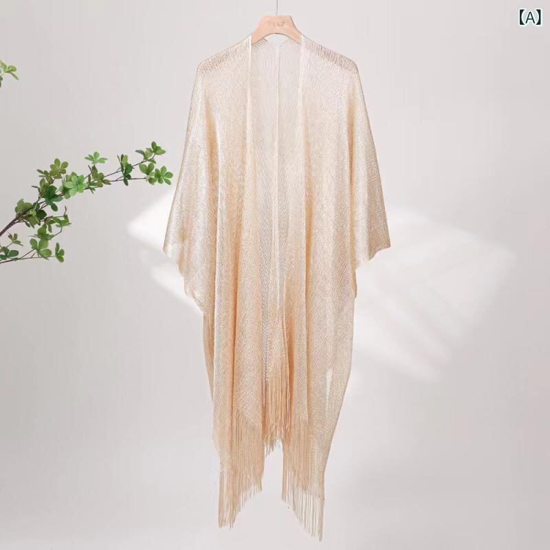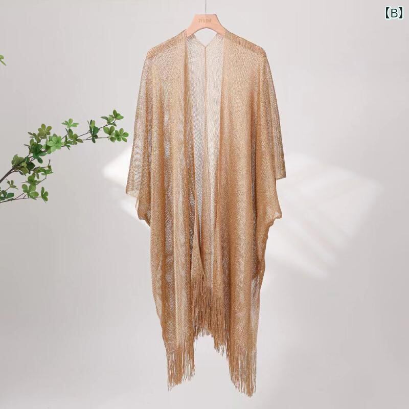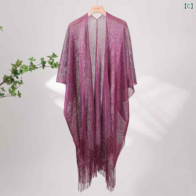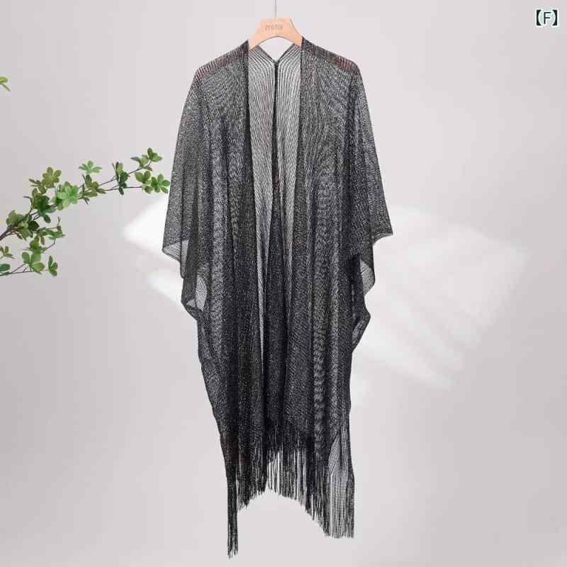 ショール レディース 欧米スタイル 夏用 日焼け対策 UVカット 薄手 フリンジ ケープ カーディガン 無地 ポリエステル 羽織り エレガント 上品 普段使い 冷房対策 体型カバー 軽量 リゾート