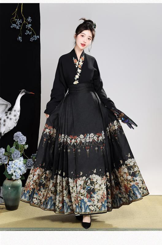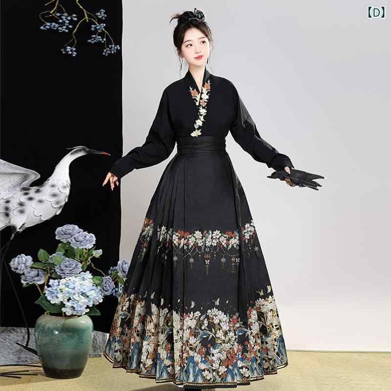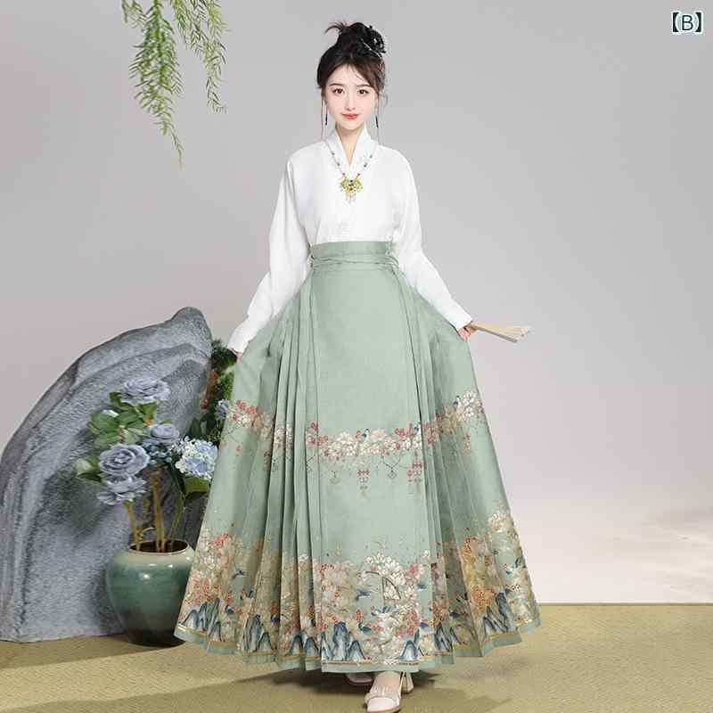 馬面スカート レディース 新中華風 明制 漢服 プリーツスカート ロングスカート ポリエステル アニマル柄 ウエストリボン Aライン レトロ 普段使い 通勤用