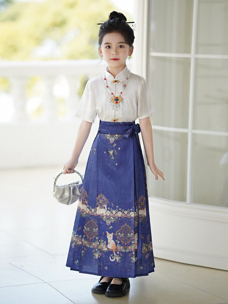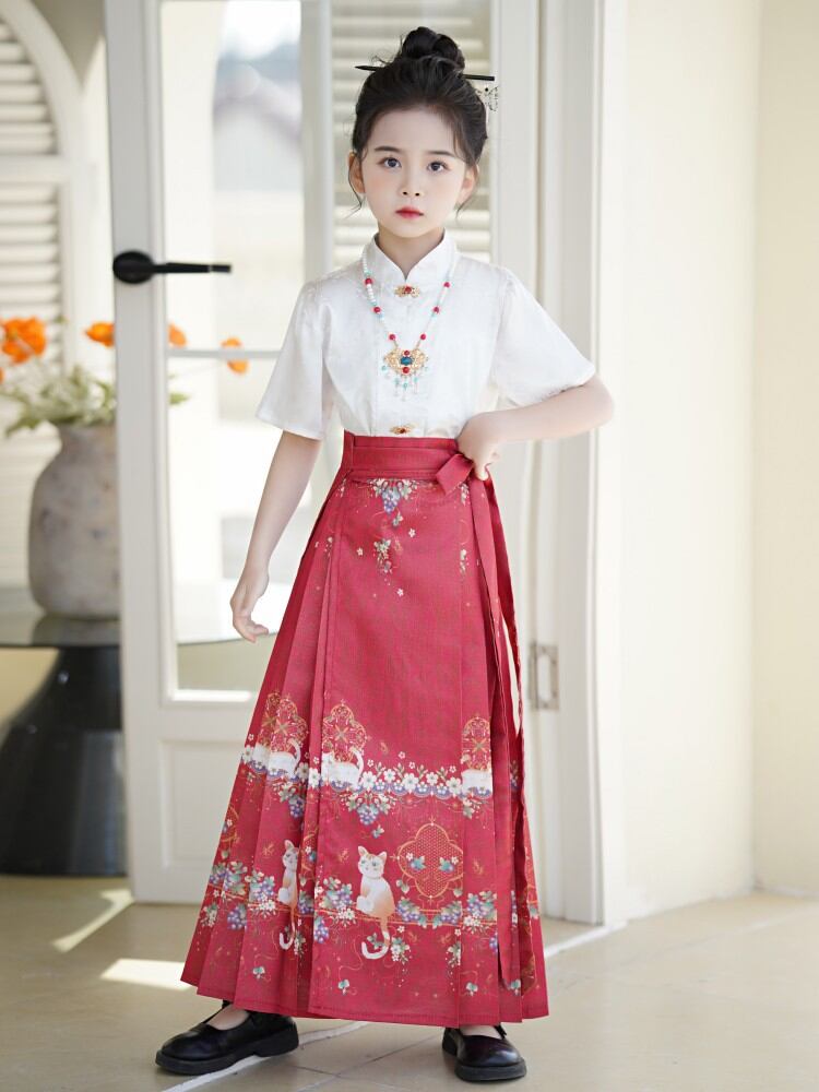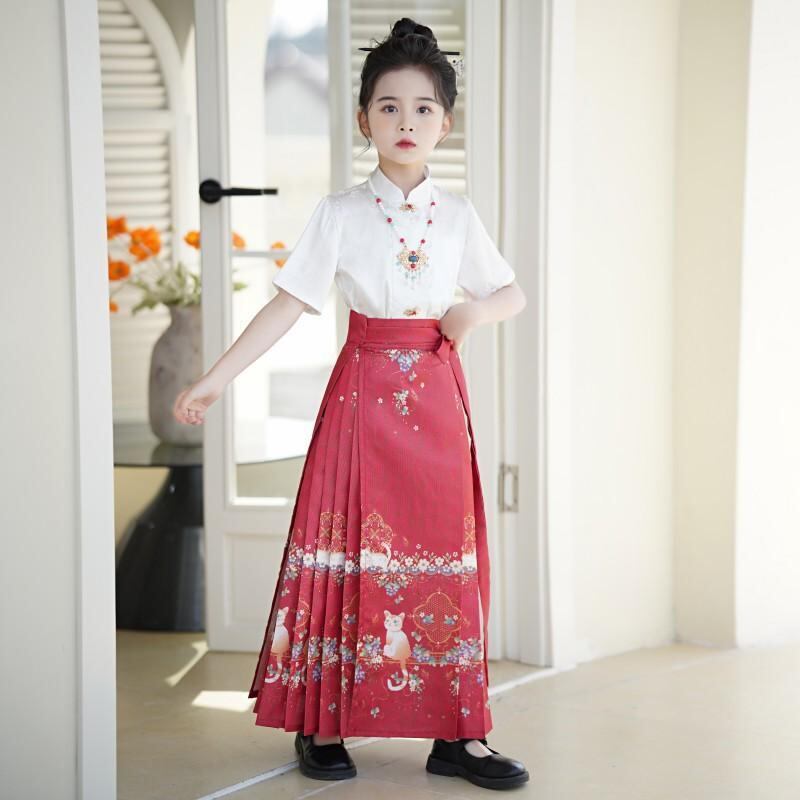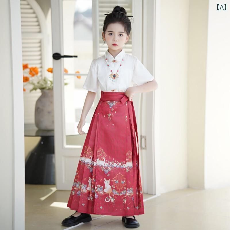 セットアップ 女の子 キッズ 漢服 馬面スカート 中国風 改良型 半袖トップス 夏用 民族衣装 子供服 コスチューム 発表会 イベント レッド ブルー