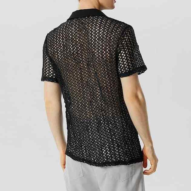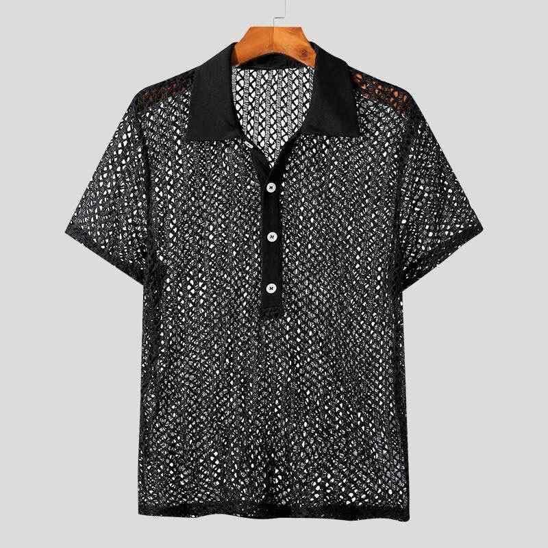 シャツ メンズ ニット 襟付き 半袖 ルーズフィット シアー 透かし編み 無地 ポリエステル 薄手 通気性 防シワ イージーケア 普段使い カジュアル