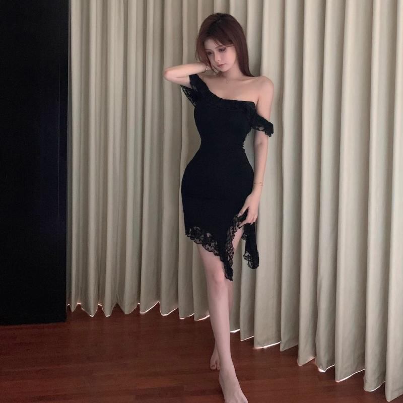 ワンピース レディース キャミソール レース セクシー 純欲系 スリムフィット 細見え アシンメトリー ショート丈 タイト Uネック ノースリーブ リトルブラックドレス ブラック ポリエステル