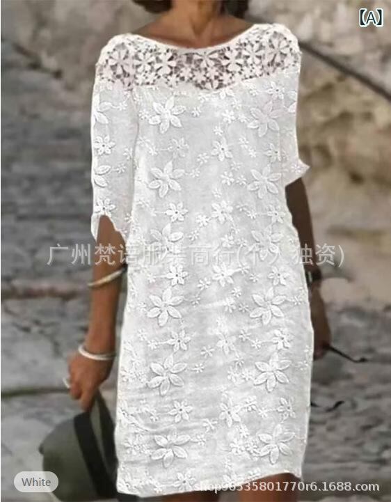 ・カテゴリ: ワンピース ・スタイル: エレガントカジュアル、アーバン ・主な素材: ポリエステル約80~90% ・ネックライン: Vネック ・袖丈: 半袖 ・柄: 幾何学模様 ・カラー展開: ホワイト ・サイズ展開: S、M、L、XL、XXL、XXXL ・デザイン: プルオーバー ・スカート丈: ミディ丈 ・スカートの形: Aライン ・袖の形: レギュラー ・ウエスト: ミドルウエスト ・装飾: レース