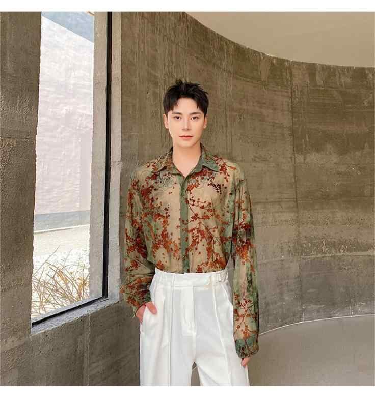 シャツ メンズ 水墨画風 花柄 ジャガード織り 刺繍 シアー シフォン 長袖 UVカット 薄手 ゆったり ルーズフィット カジュアル ストリート ダンス オリエンタルテイスト
