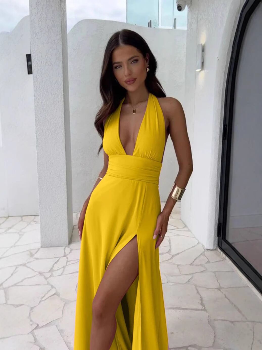 ワンピース レディース ホルターネック Vネック スリット ハイウエスト 無地 ロング丈 エレガント 高級感 上品 ポリエステル スパンデックス ストレッチ シワ加工 リゾート