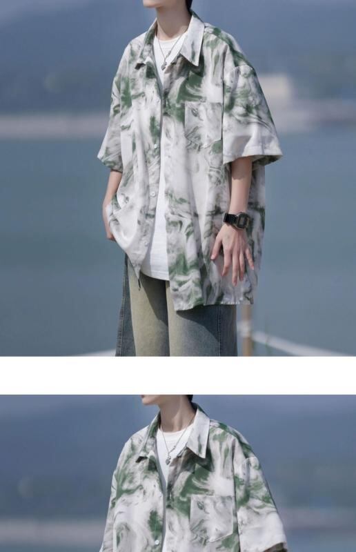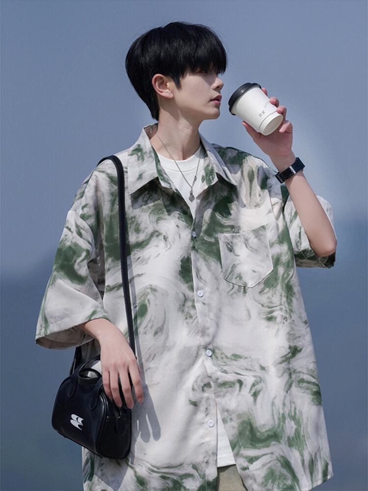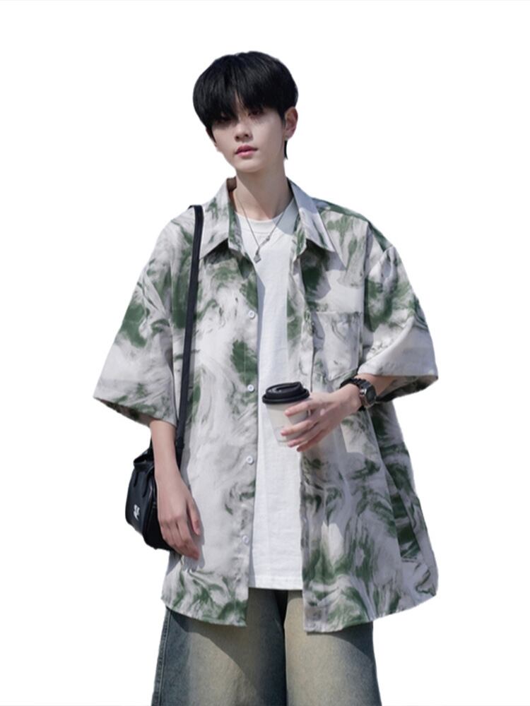 シャツ メンズ 半袖 タイダイ柄 花柄 接触冷感 ゆったり ビッグシルエット 開襟シャツ リゾート ビーチ カジュアル 夏用 ポリエステル グリーン グレー ブラウン