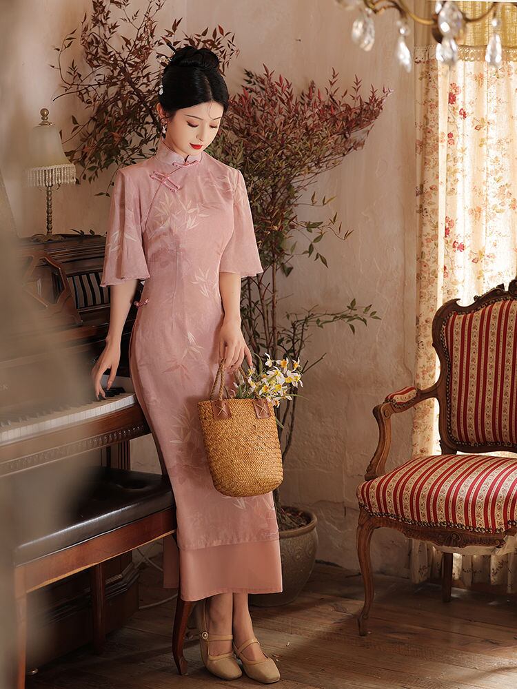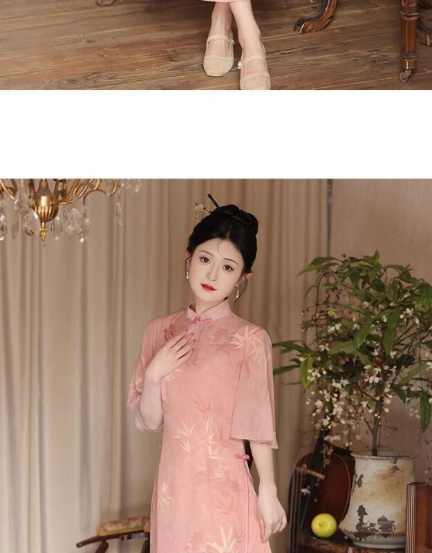 チーパオ レディース 若い女性向け ピンク 改良型 レトロ ミドル丈 スタンドカラー 七分袖 斜め襟 スリット入り 茶会服 お茶会着 普段使い デイリーユース エレガント ポリエステル