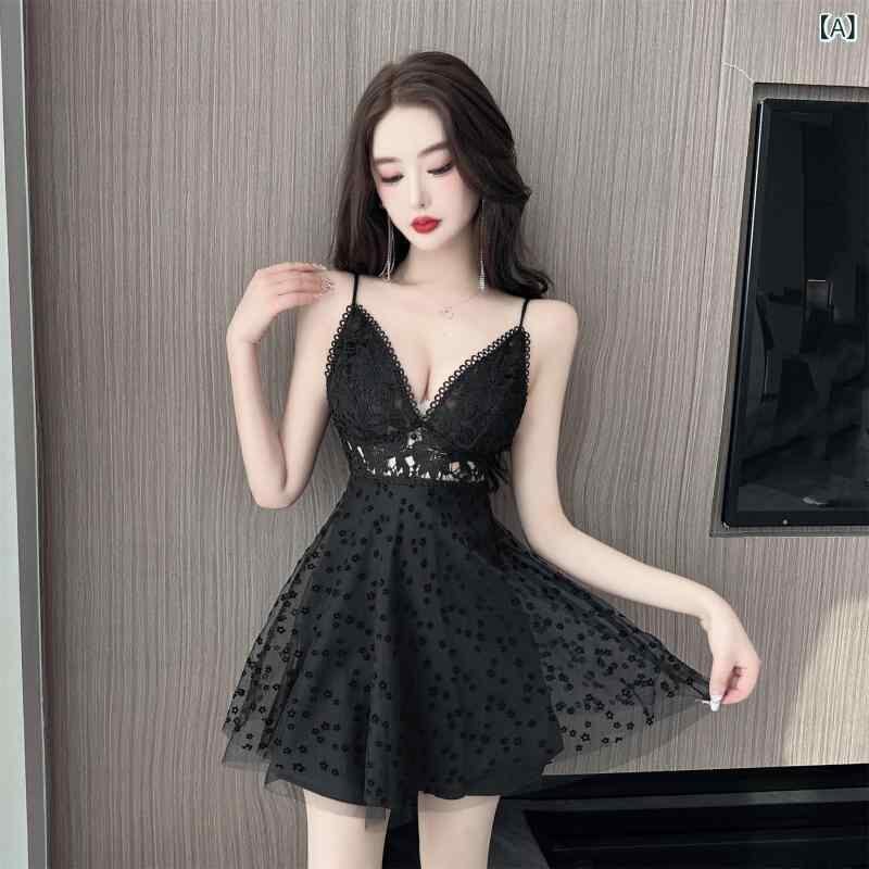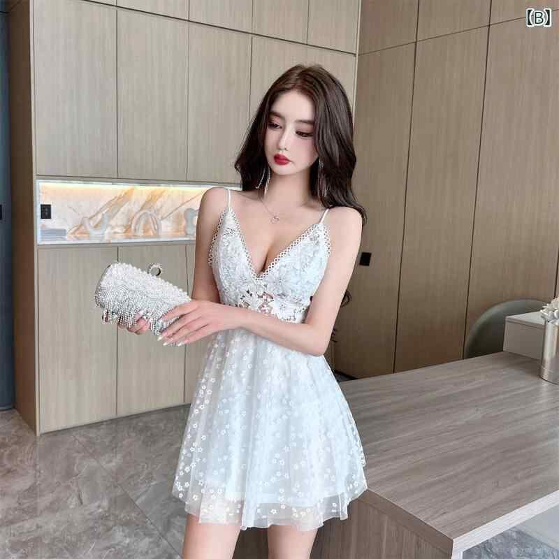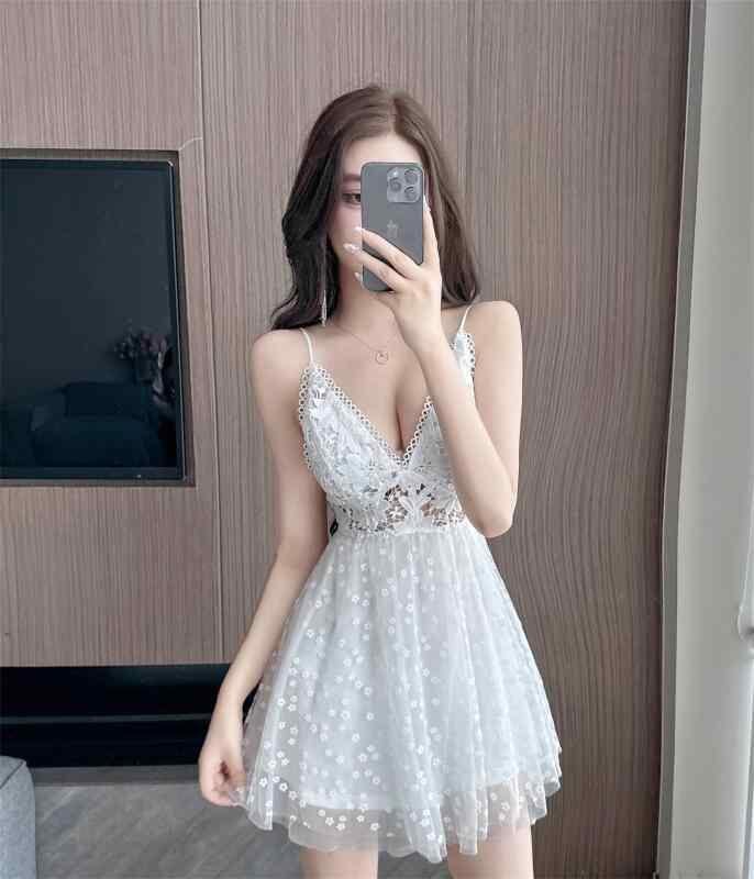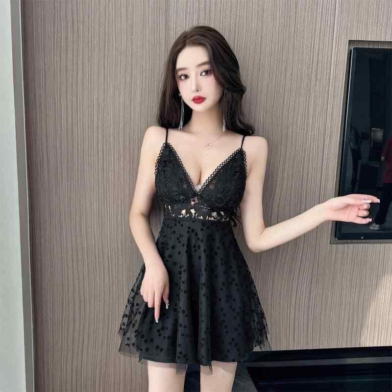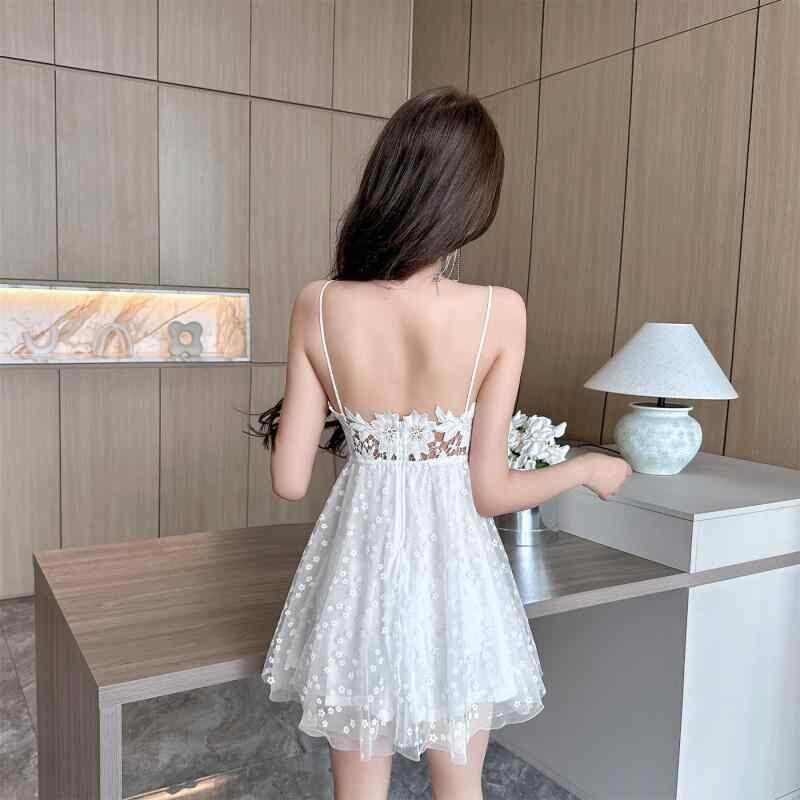 ワンピース レディース セクシー レース 透かし編み ウエストマーク バックオープン ショート丈 フレア キャミソール Vネック ハイウエスト ブラック ホワイト