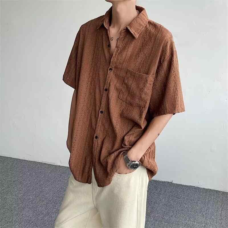 シャツ メンズ 男性用 レトロ 透かし編み 開襟 半袖 ゆったり ルーズフィット ポリエステル混紡 薄手 個性的デザイン 夏物 カジュアルスタイル 普段使い