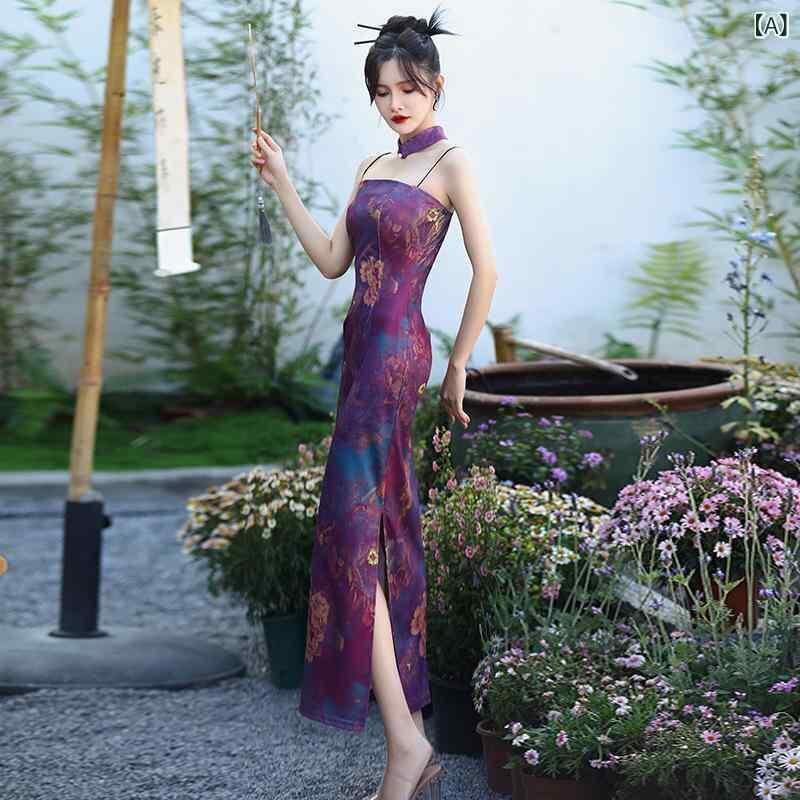 ワンピース レディース レトロ ヴィンテージ 改良 チャイナドレス キャミソール ノースリーブ スクエアネック ミモレ丈 ゆったりサイズ 伸縮性 夏 普段使い ポリエステル 再生繊維 裾スリット パープル ピーコックグリーン インフルエンサー トレンド