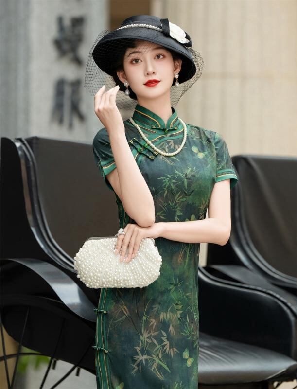ワンピース レディース チャイナドレス 夏 改良型 高級感 中華風 普段使い エレガント ロング丈 レトロモダン ポリエステル スパンデックス サテン調 立ち襟 斜め襟 ショートスリーブ サイドスリット 立体柄 微ストレッチ