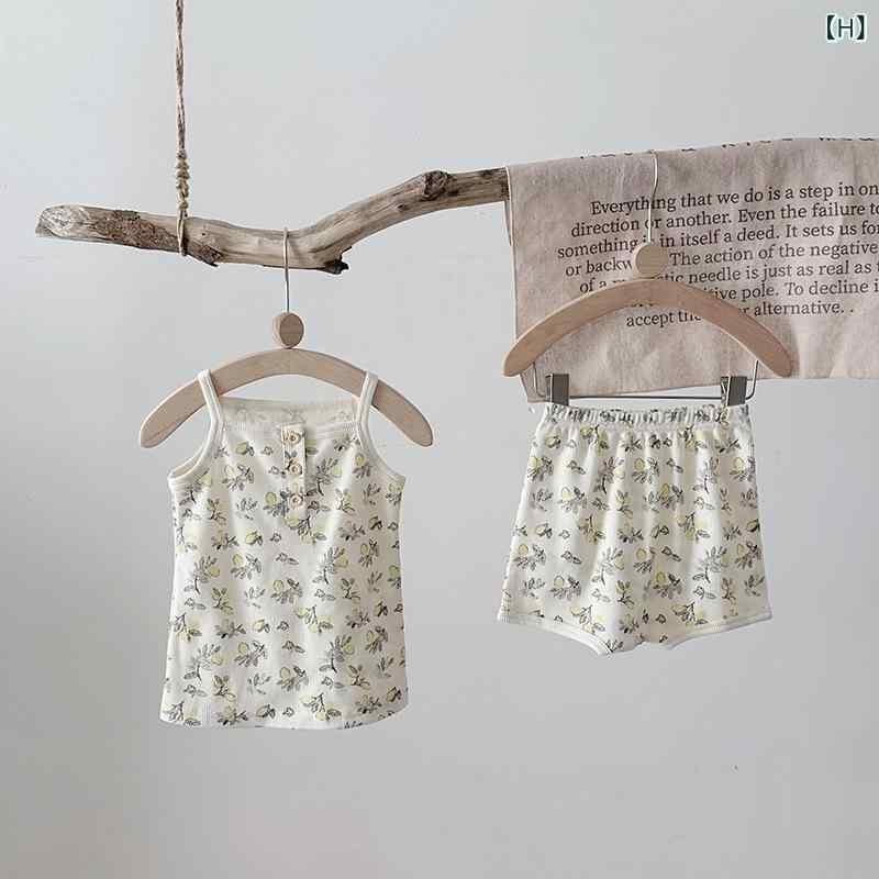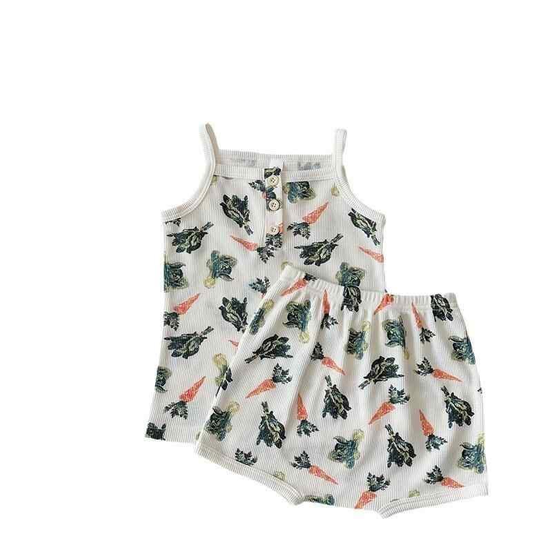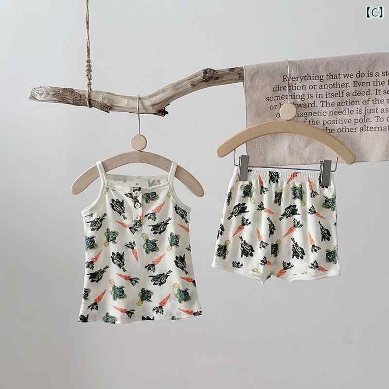 ベビー服 キッズ 男の子 女の子 男女兼用 夏用 ルームウェア パジャマ 部屋着 ワッフル生地 綿 コットン 天然素材 タンクトップ キャミソール セットアップ 上下セット 柔らか 優しい肌触り かわいい 総柄 フルーツ柄 野菜柄