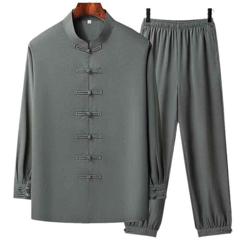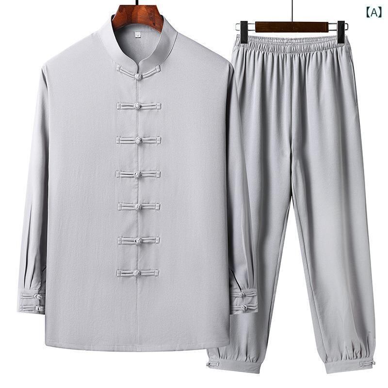 太極拳ウェア 男性用 シニア向け 高級感 中国風 唐装 練習着 功夫シャツ ポリエステル素材 ライトグレー ダークグレー 普段使い レジャー
