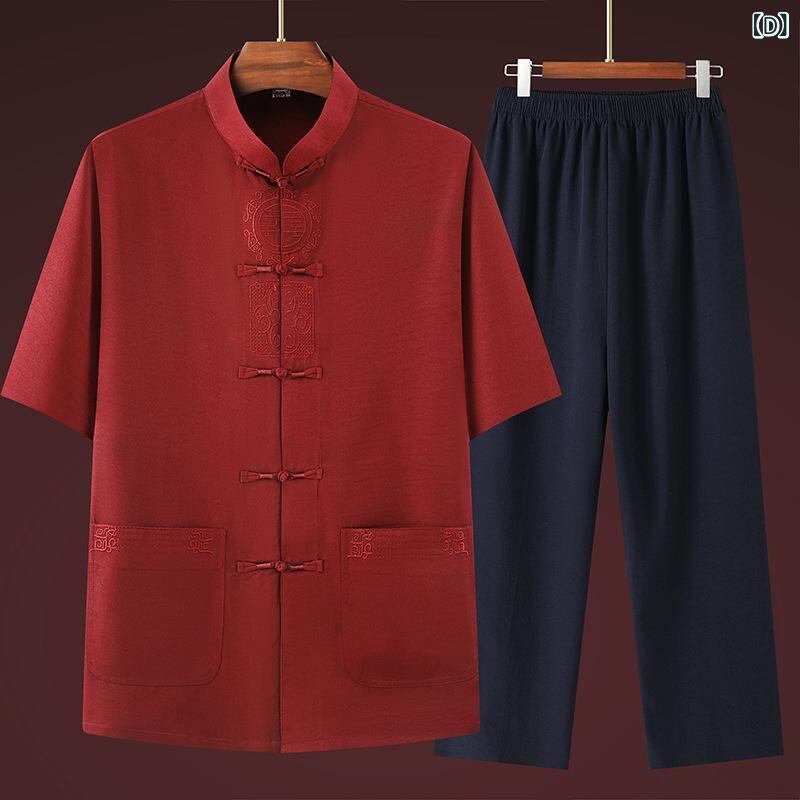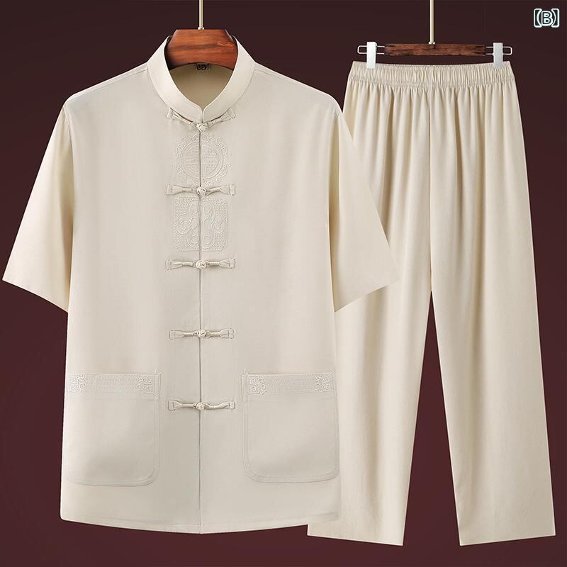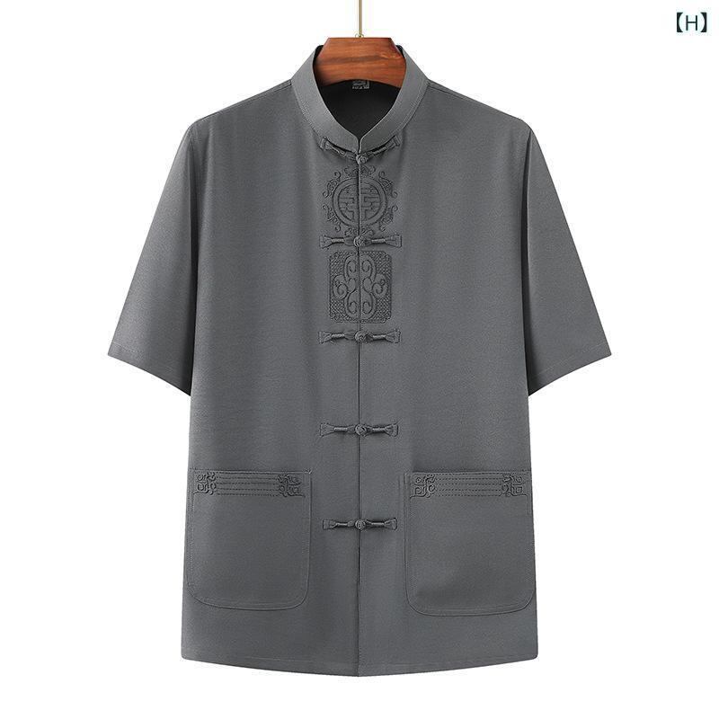 セットアップ メンズ お父さん おじいちゃん 半袖 シャツ 上下セット 麻混紡 ポリエステル 薄手 軽量 涼しい 太極拳服 唐装 中華風 伝統衣装 普段使い 部屋着 リラックスウェア 練習着