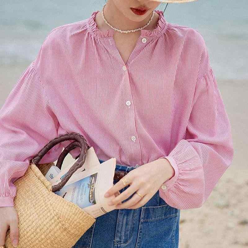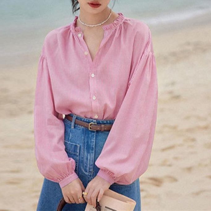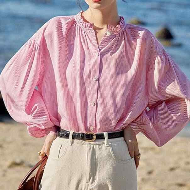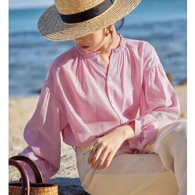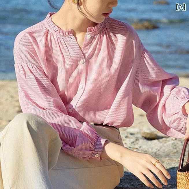 シャツ レディース ピンク ストライプ スタンドカラー パフスリーブ 長袖 ゆったり UVカット 体型カバー ポリエステル 夏 リゾート カジュアル 普段使い かわいい シック ブラウス