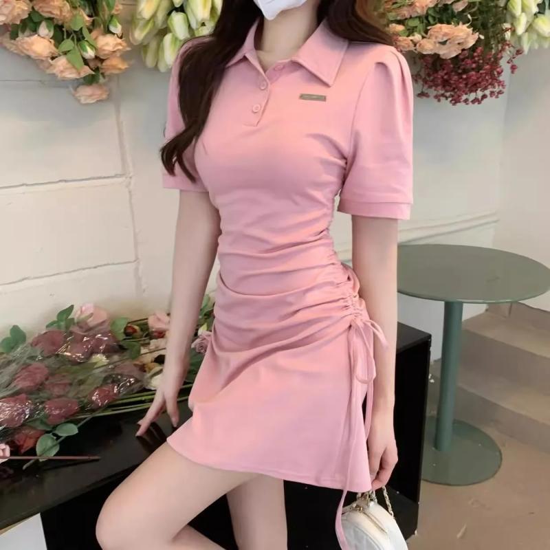 ワンピース レディース ポロ襟 半袖 ドローストリング Aライン ミニ丈 甘辛スタイル ヘルシーセクシー スリムフィットデザイン ポリエステル ゆったりサイズ