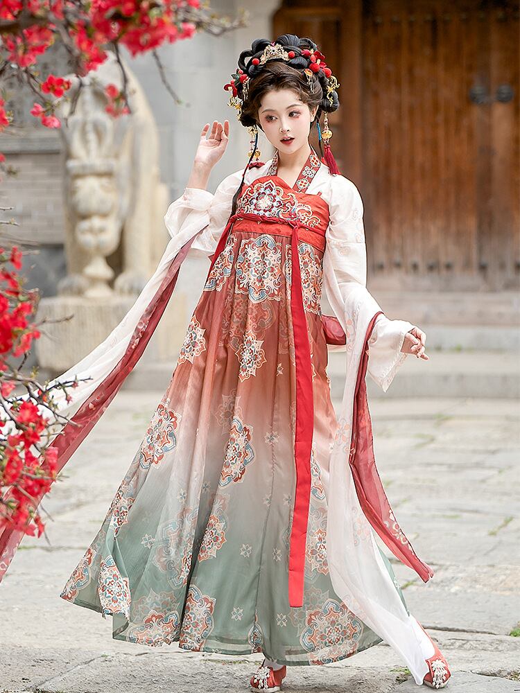 漢服 レディース ハイウエスト ロングドレス 中国伝統衣装 グラデーションカラー シフォン 再生繊維 マイクロファイバー 刺繍 上品 エレガント 普段使い デイリーユース