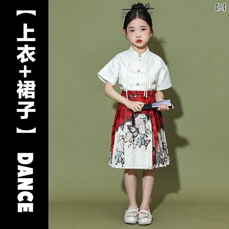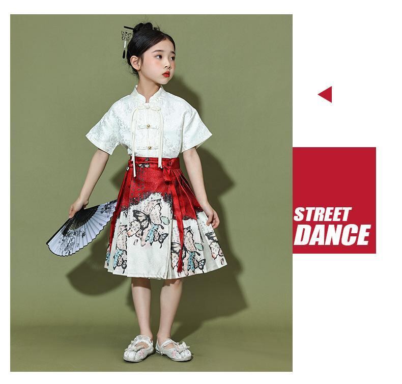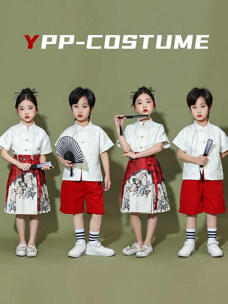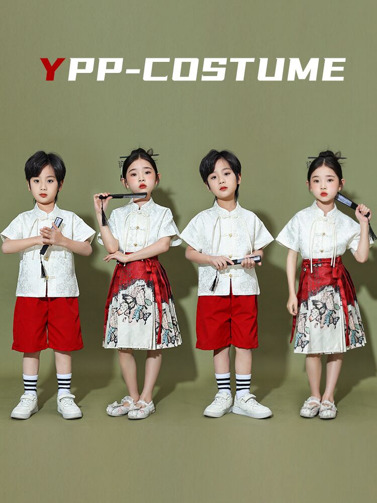 子供服 キッズ 漢服 中国風 演出服 舞台衣装 馬面スカート セットアップ 合唱発表会 お遊戯会 イベント チアリーディング 応援団 男女兼用 夏用 オールシーズン 綿混 ポリエステル チャイナボタン 蝶モチーフ