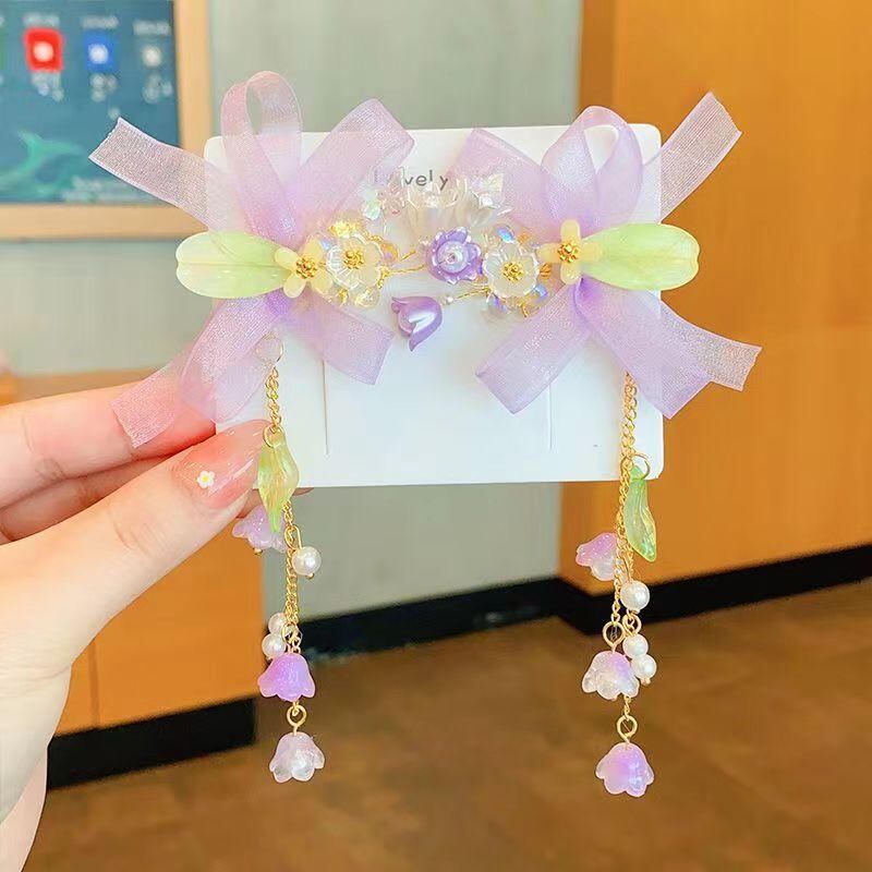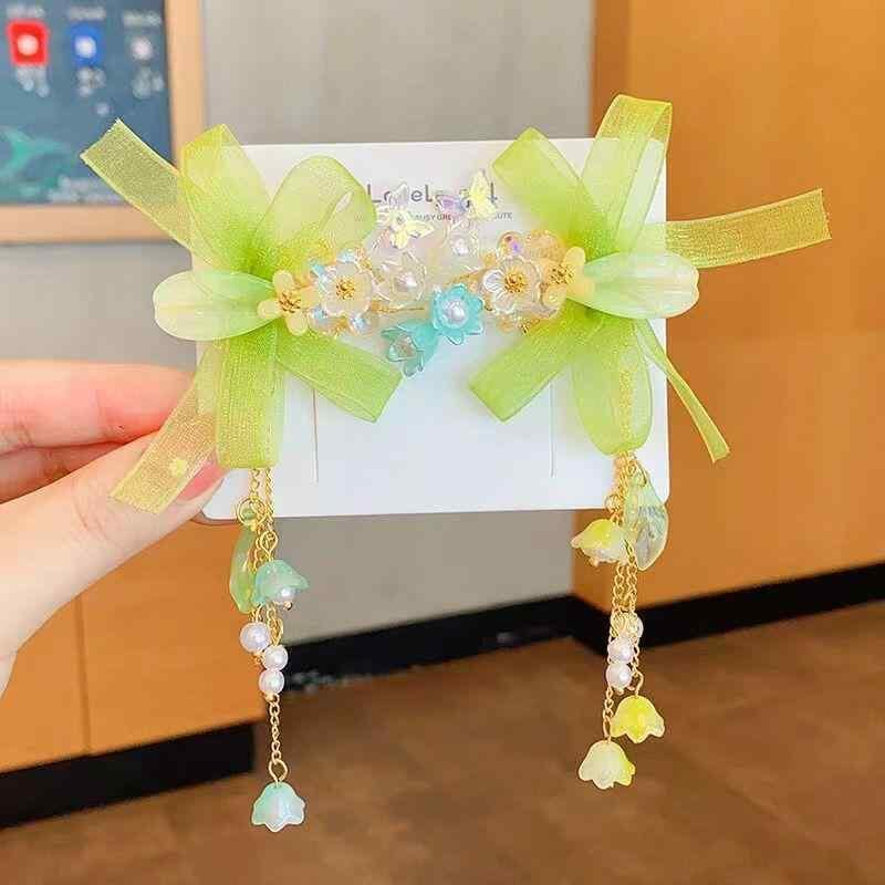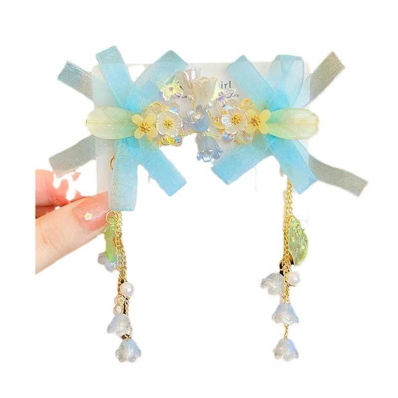 ヘアクリップ 女の子 キッズ 中国風 古典風 リボン 蝶々結び アクリル 髪飾り 浴衣 七五三 発表会 イベント かわいい ハンドメイド パール ピンク ブルー パープル グリーン