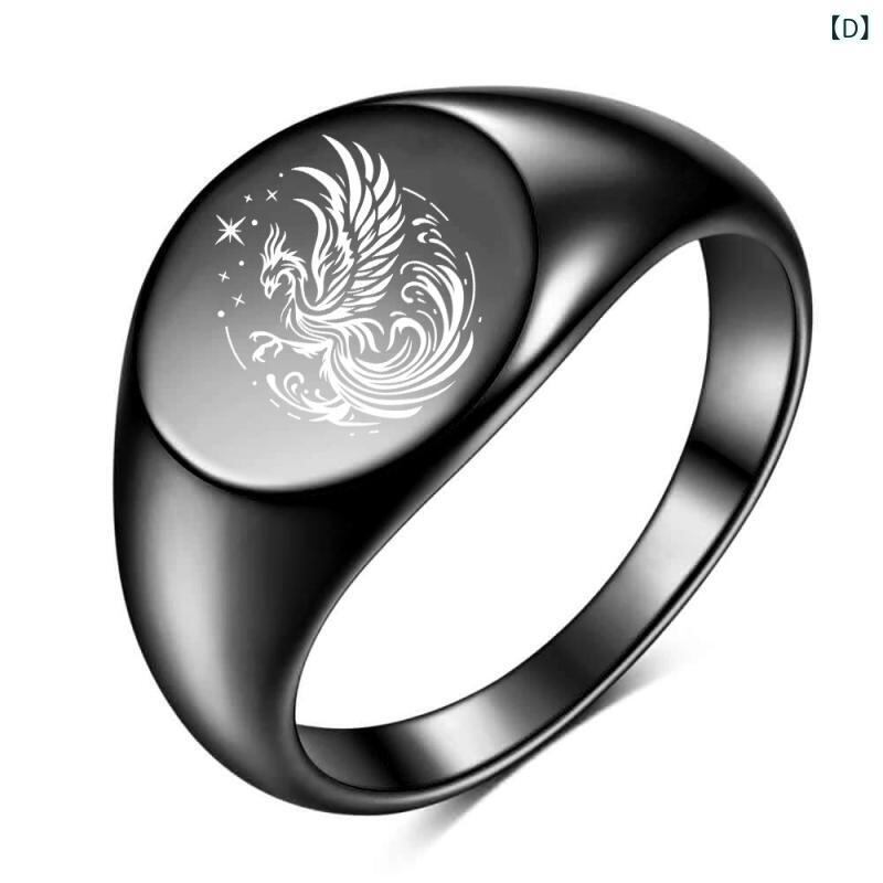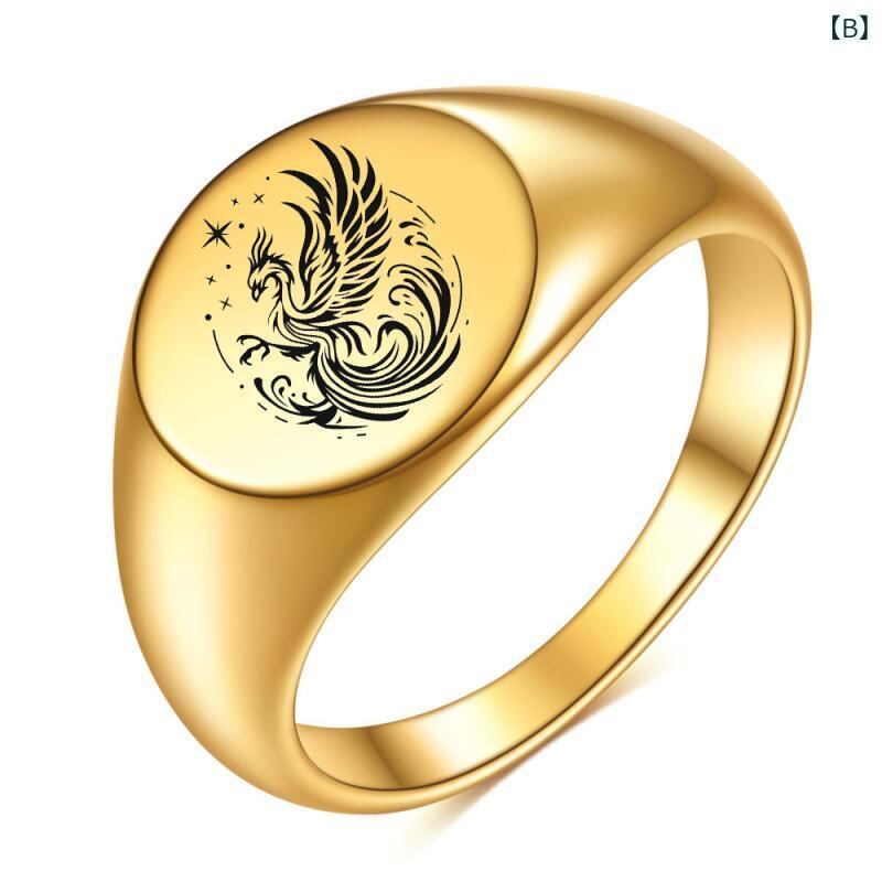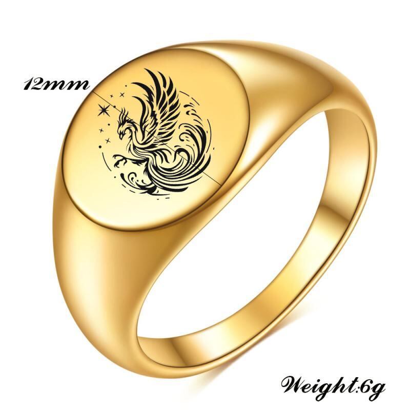 指輪 レディース メンズ チタン鋼製 12mm 光沢 楕円形 レーザー彫刻 鳳凰モチーフ 18Kゴールドメッキ 高級感 インスタ風 個性的 普段使い カジュアル