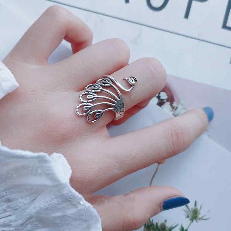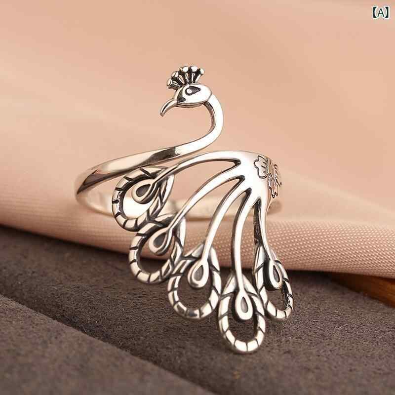 リング レディース レトロ エスニック クラシック 銅製 タイシルバー調 オープンリング サイズ調整可能 孔雀 鳳凰 モチーフ 個性的 存在感 大ぶり 高級感