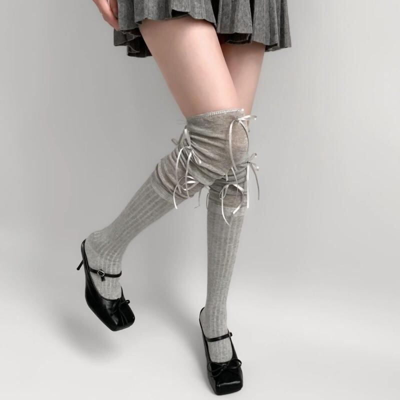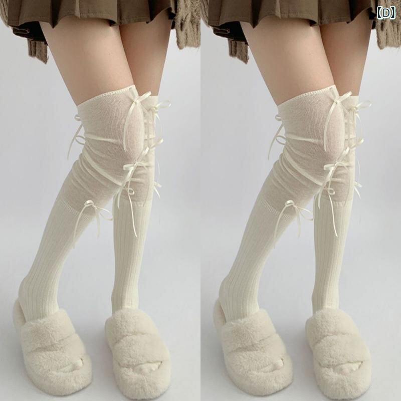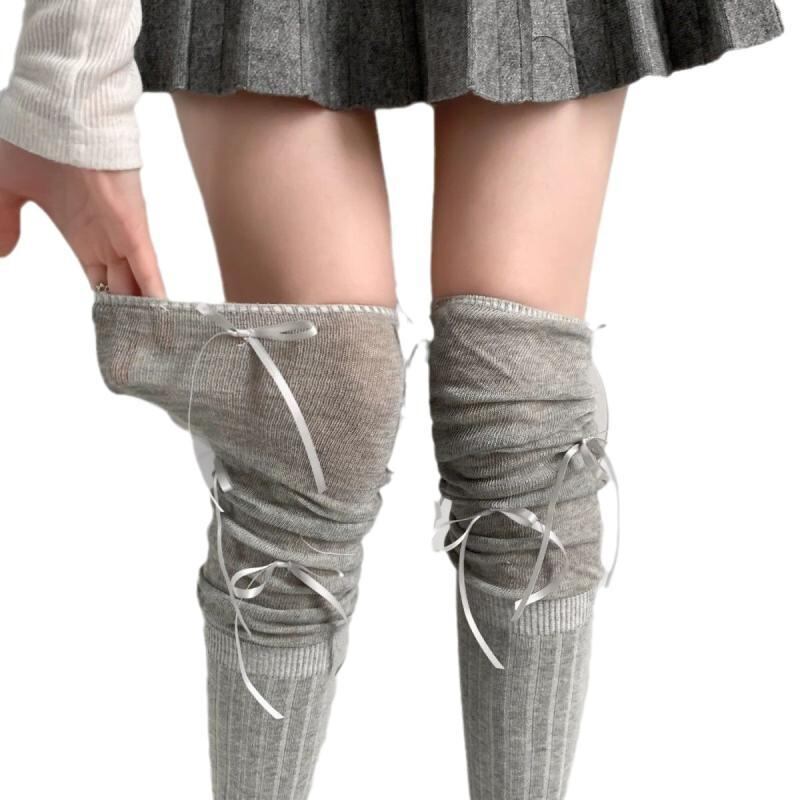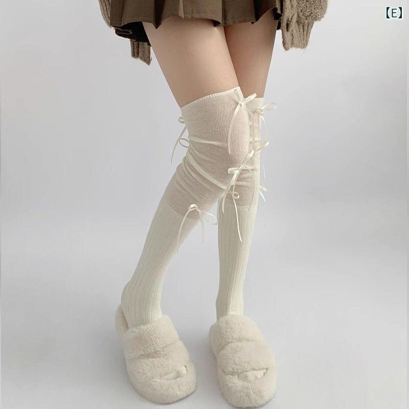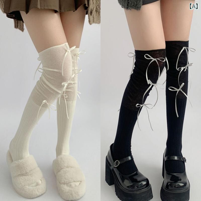 オーバーニーソックス レディース ロリータ バイカラー リボン 薄手 ルーズソックス 抗菌 防臭 ポリエステル オールシーズン 無地 白 黒 グレー ベージュ 普段使い カジュアル