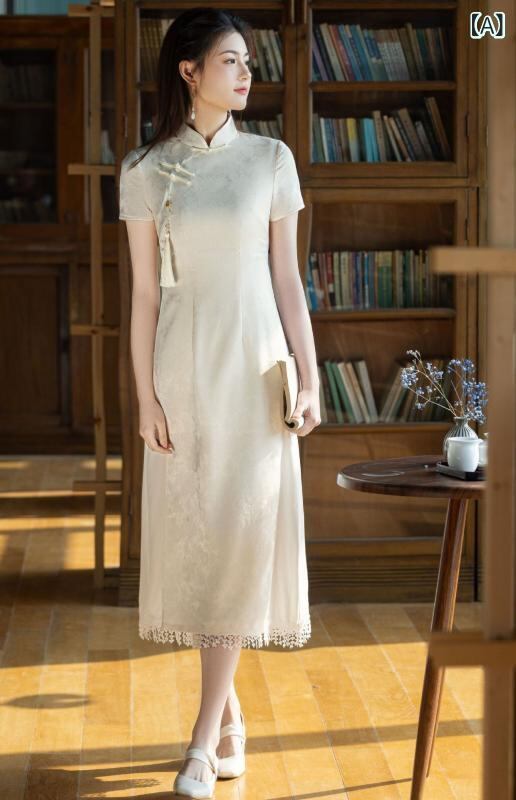 ワンピース レディース 新チャイナドレス レトロ クラシック 半袖 スリムフィット エレガント 上品 ロング丈 ジャガード織り ポリエステル スタンドカラー 斜め襟 ハイウエストスリット オフホワイト レッド