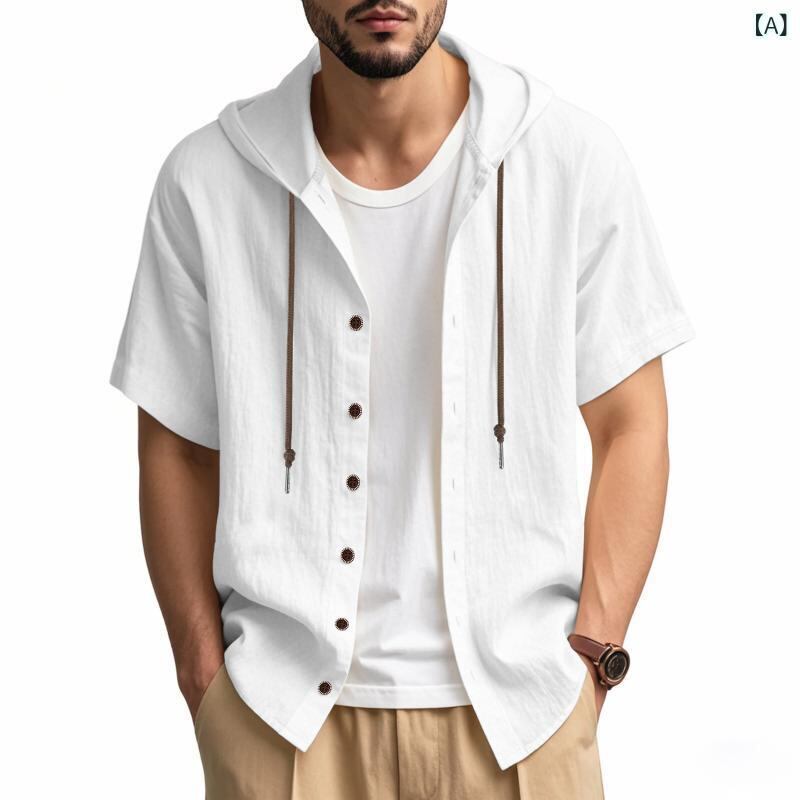 シャツ メンズ 男性用 アメリカンスタイル 半袖 フード付き リネン混 薄手 通気性 アメカジ カジュアル ゆったり オーバーサイズ ルーズフィット 夏 サマー トップス イージーケア 定番カラー