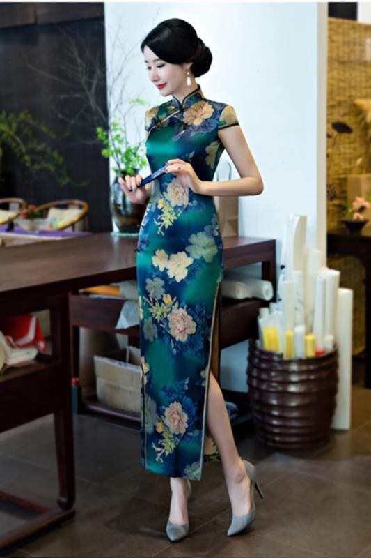 チャイナドレス レディース オールド上海 改良版 シルク 香雲紗 ロング丈 エレガント 上品 ポロ襟 ノースリーブ ハイ スリット 大きいサイズ ストレッチ フォーマル