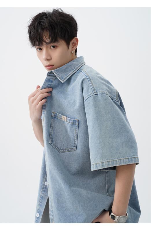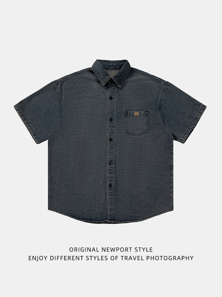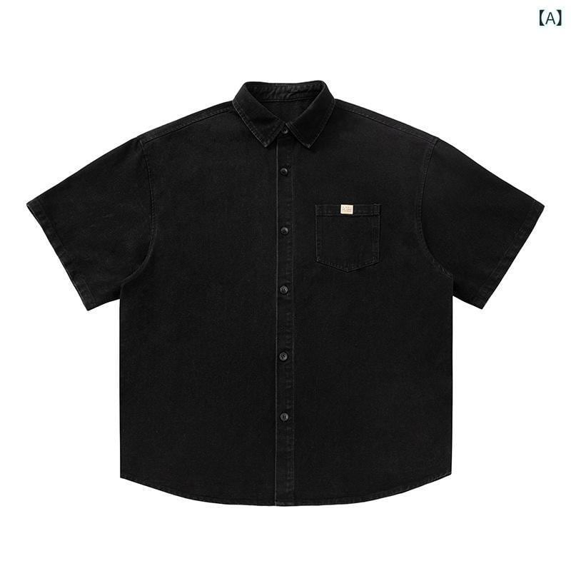 シャツ メンズ デニム 半袖 ウォッシュ加工 ヴィンテージ レトロ オーバーサイズ ビッグシルエット カジュアル ストリート アメカジ 無地 ポケット付き 綿混 コットンブレンド 黒 ライトブルー ダークブルー