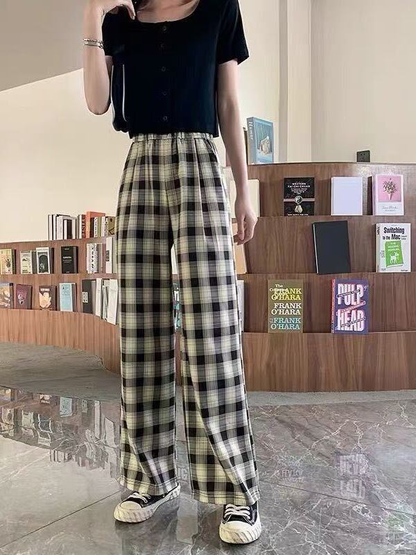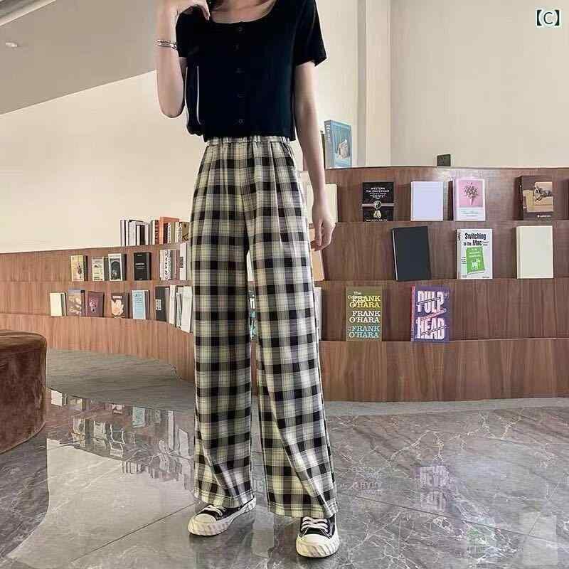 パンツ レディース 薄手 ワイド ストレート ハイウエスト チェック柄 カジュアル 韓国 ゆったり 体型カバー 涼しい 快適