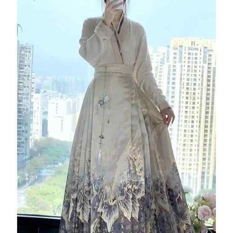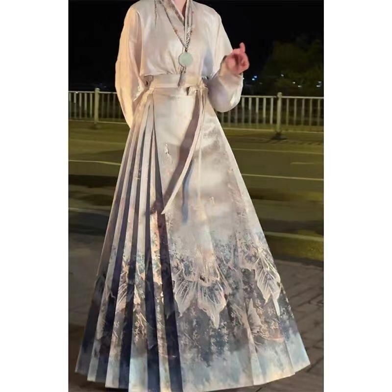 セットアップ レディース 新中華風 エスニック 馬面スカート ロングスカート プリーツスカート 明代漢服スタイル デイリーユース 通勤 オフィス カジュアル 春用 トリアセテート混紡