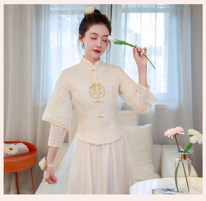 パーティードレス レディース ブライズメイドドレス 中華風 レトロ ロング丈 Aライン オフショルダー ノースリーブ パールボタン パフスリーブ シェニール スパンデックス混 グレー ピンク