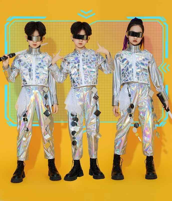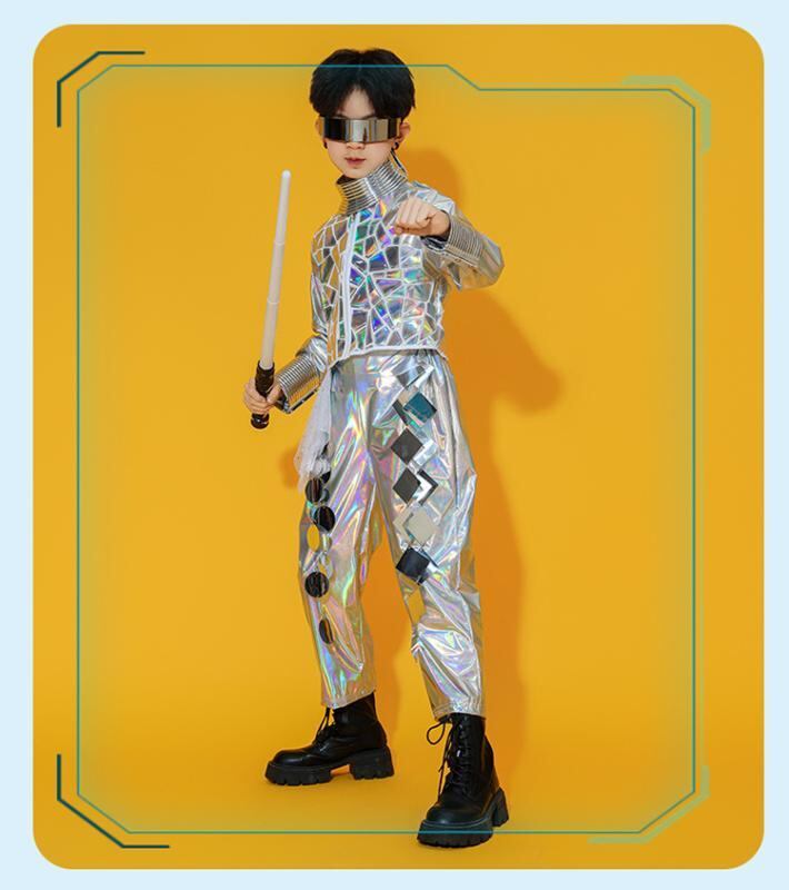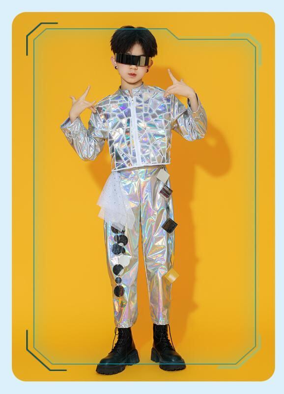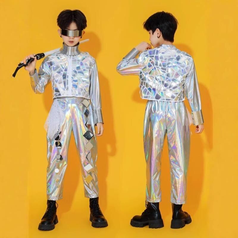 ダンス衣装 キッズ 男女兼用 ロボット 宇宙服 近未来 メタリック シルバー 光沢感 パフォーマンスウェア セットアップ ステージ 発表会 学芸会 イベント衣装
