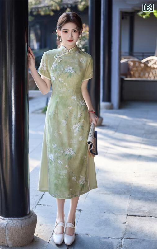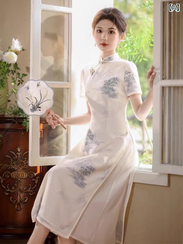 チャイナドレス レディース ロング丈 新中国風 アオザイ風 スタンドカラー 斜め合わせ 半袖 高級感 エレガント 山水柄 プリント ポリエステル 麻調 ストレッチ スリット入り 二重仕立て レトロ クラシック
