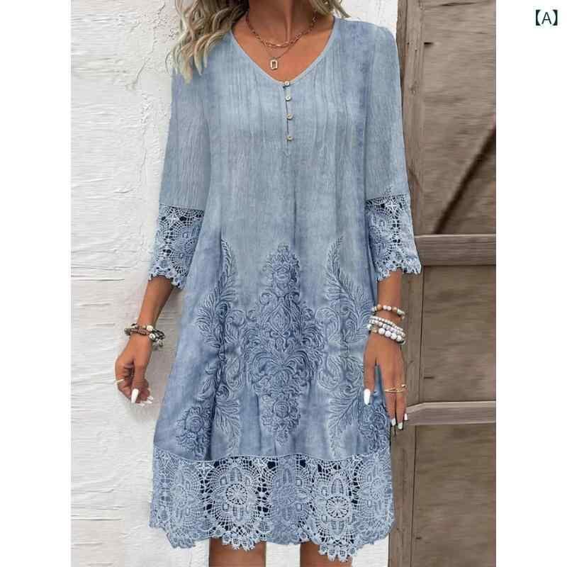 ワンピース レディース 無地 レース フリル Vネック 五分袖 花びらスリーブ Aライン ミニ丈 ゆったりウエスト プルオーバー ポリエステル素材 カジュアル 普段使い ブルー グリーン ベージュ