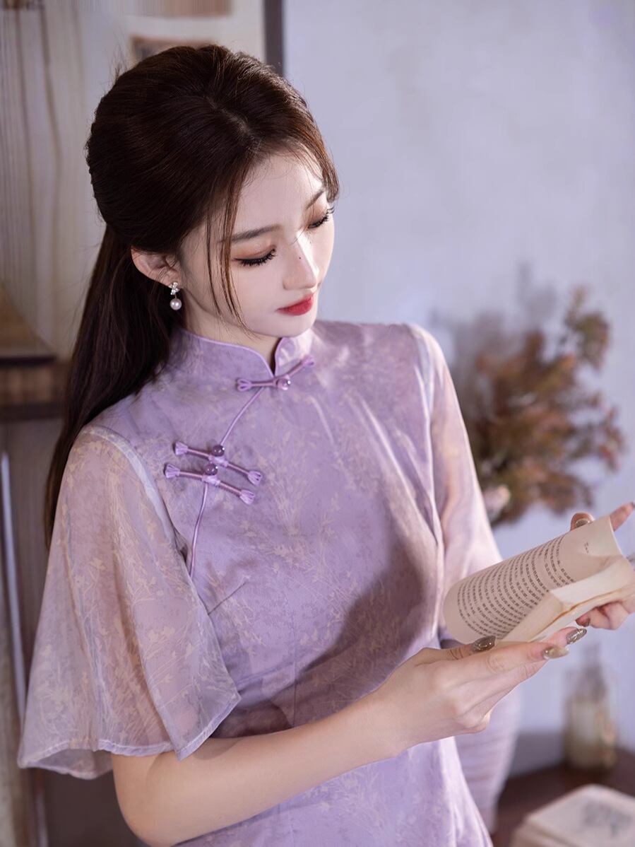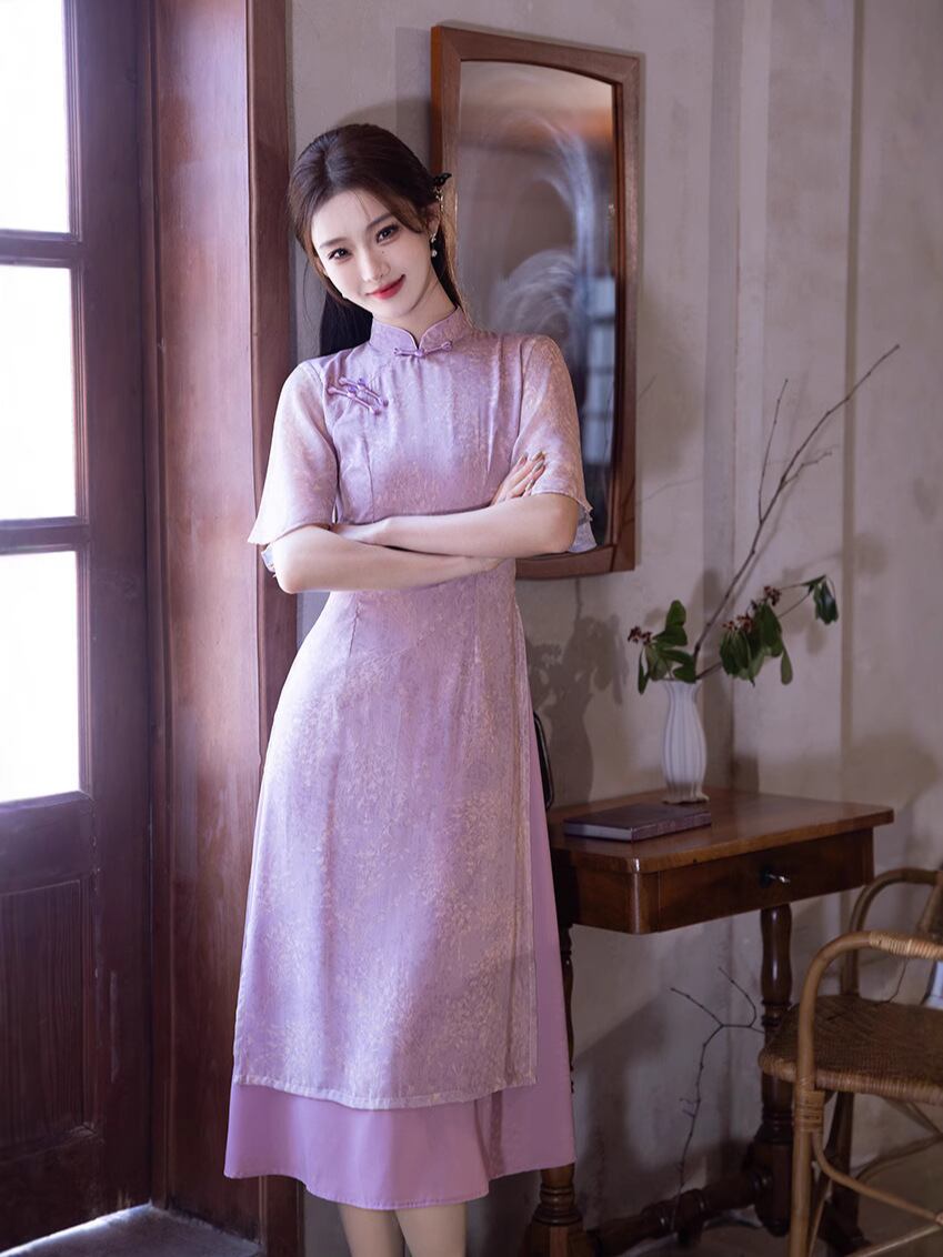 チャイナワンピース レディース アオザイ風 ロング丈 バイオレット フレア七分袖 改良版 エレガント ドレッシー 普段使い レトロ スタンドカラー サイドスリット シルク混 伸縮性