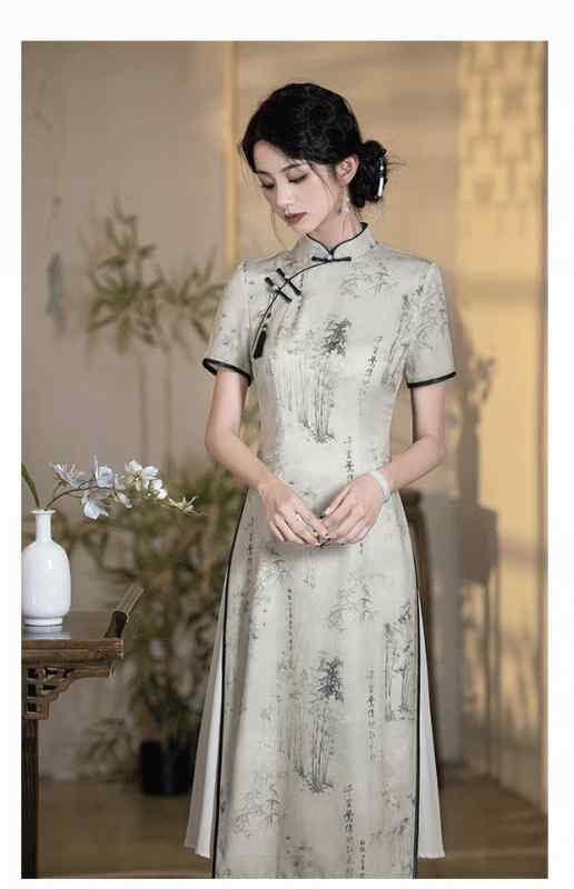 ワンピース レディース 普段使い モダンチャイナスタイル 高級感 ミディ丈 スタンドカラー 長袖 ポリエステル シワ加工 微ストレッチ レトロ グリーン サイドスリット