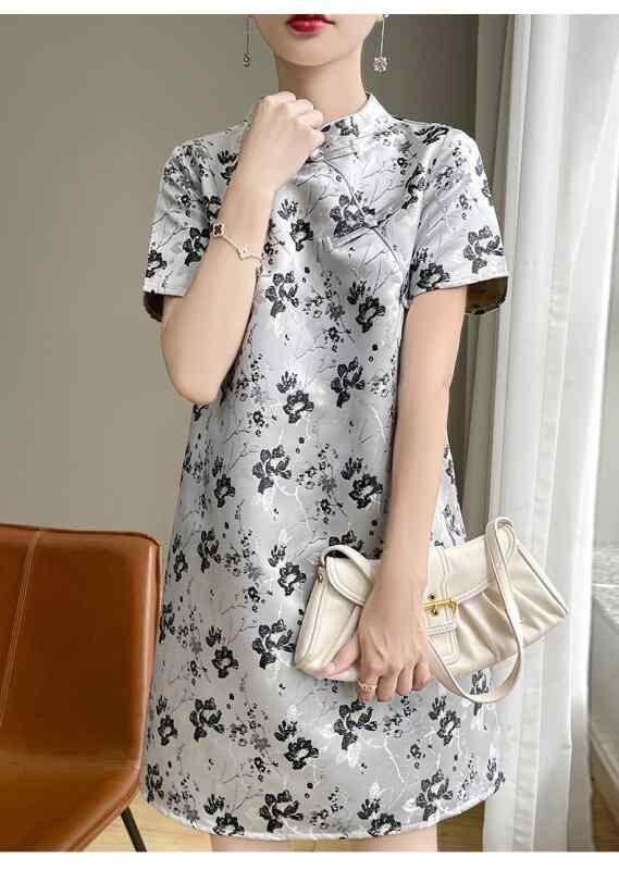 ワンピース レディース 改良チャイナドレス風 ネオチャイニーズスタイル 国風 ジャカード織り 飾りボタン 半袖 スタンドカラー ミディ丈 タイトスカート 高級感 上品 エレガント ポリエステル サテン調 光沢 通勤 オフィス ベージュ ピンク グレー