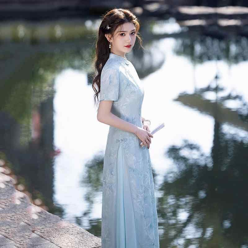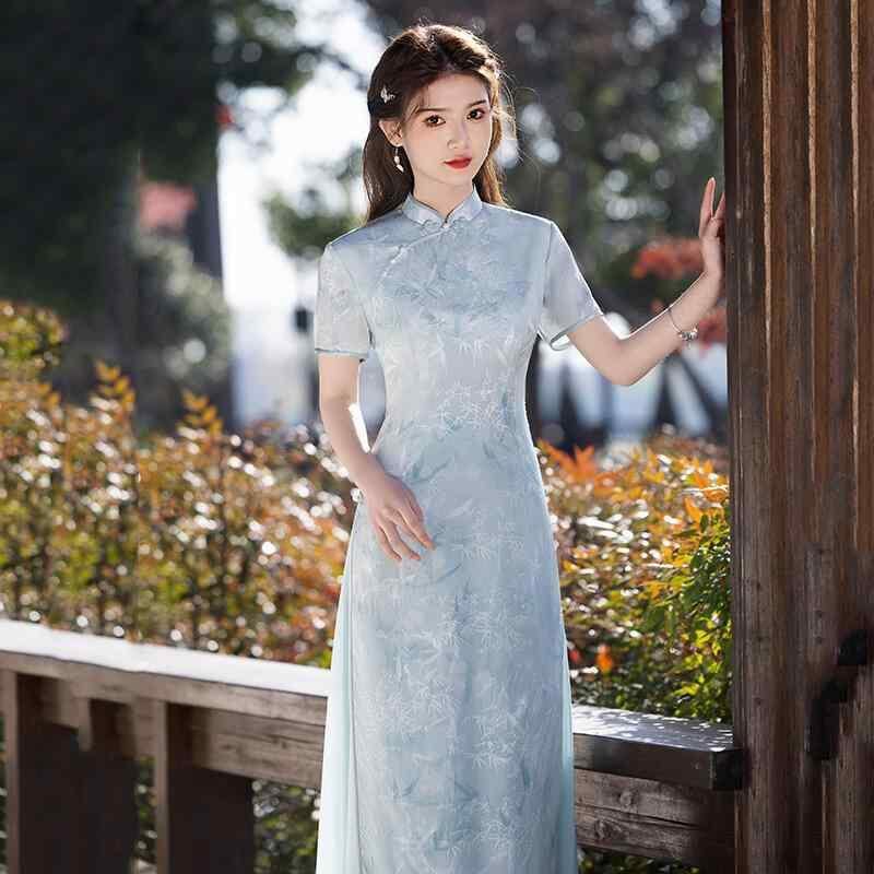 チャイナドレス レディース 改良 新中華風 レトロ スタイルアップ ロング丈 スタンドカラー 斜め襟 3分袖 スリット入り 再生繊維麻 ポリエステル 微ストレッチ バンブーブルー ピンク