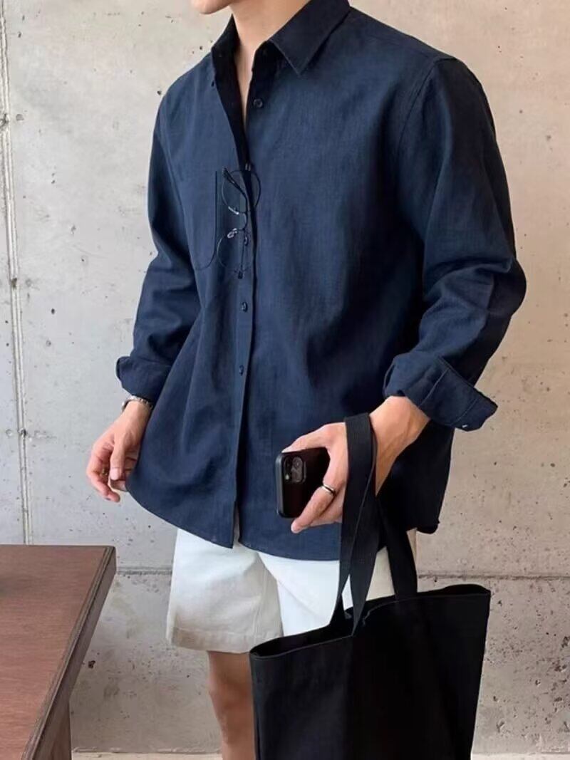 ・カテゴリ: シャツ・スタイル: ジェンダーレス・デザイン: 前開き・シルエット: ゆったり・ネックライン: 襟付き・袖丈: 長袖・柄: 無地・厚さ: 普通・デザイン詳細: ポケット付き・主な素材: ポリエステル96%以上・取り扱い: 洗濯機洗い対応・着用シーン: カジュアル・カラー展開: ブラック、ダークネイビー・サイズ展開: M、L、XL、XXL、XXXL・対象性別: 男性