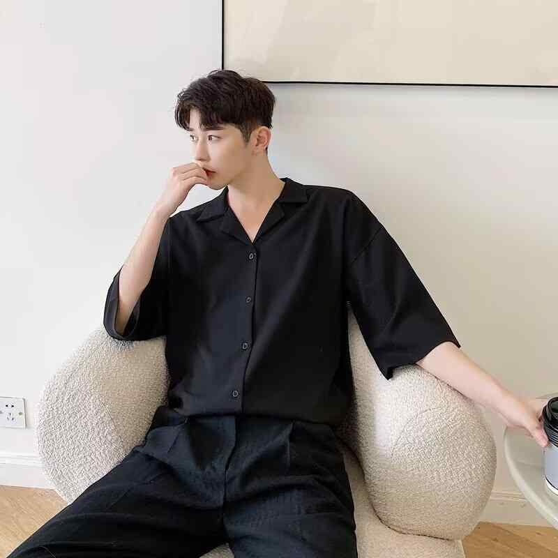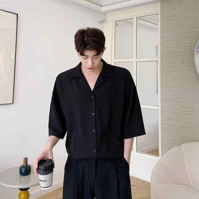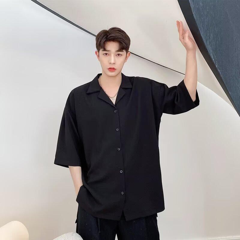 シャツ メンズ トップス 高級感 上品 洗練 こなれ感 スタイリッシュ カジュアル 七分袖 半袖 個性的デザイン 韓国風 ポリエステル素材 通気性 薄手 襟付き シワになりにくい ブラック ホワイト