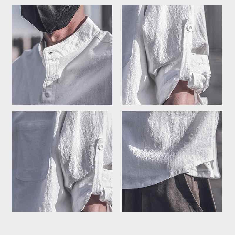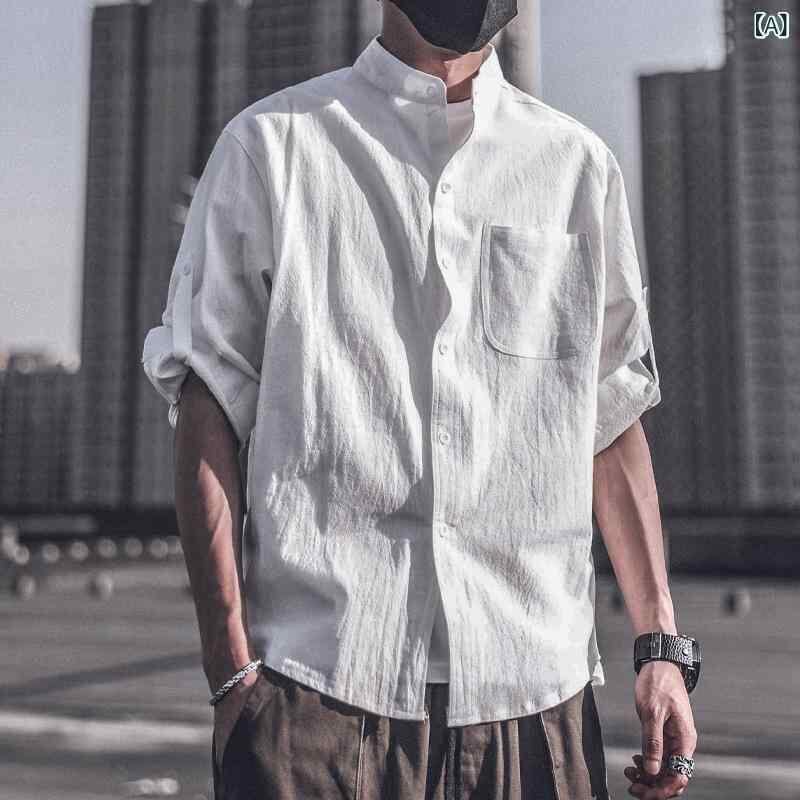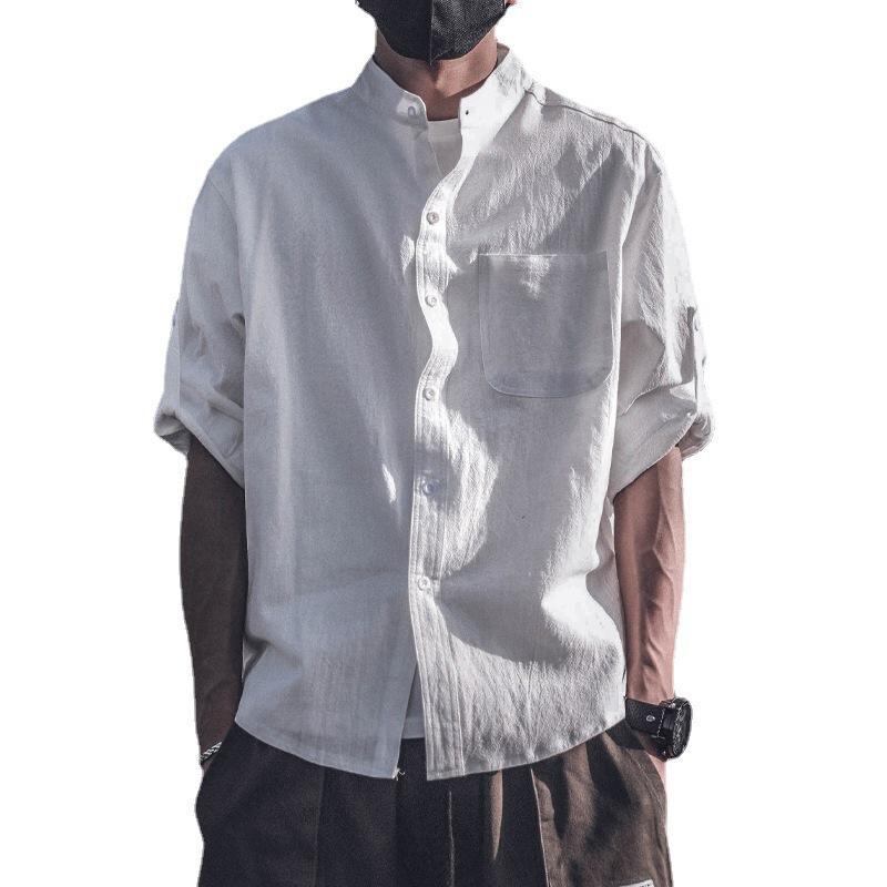 シャツ メンズ スタンドカラー 七分袖 和風 レトロ ビッグシルエット ゆったり ポリエステル 無地 普段使い シワになりにくい アイロン不要 スマートカジュアル トレンド感